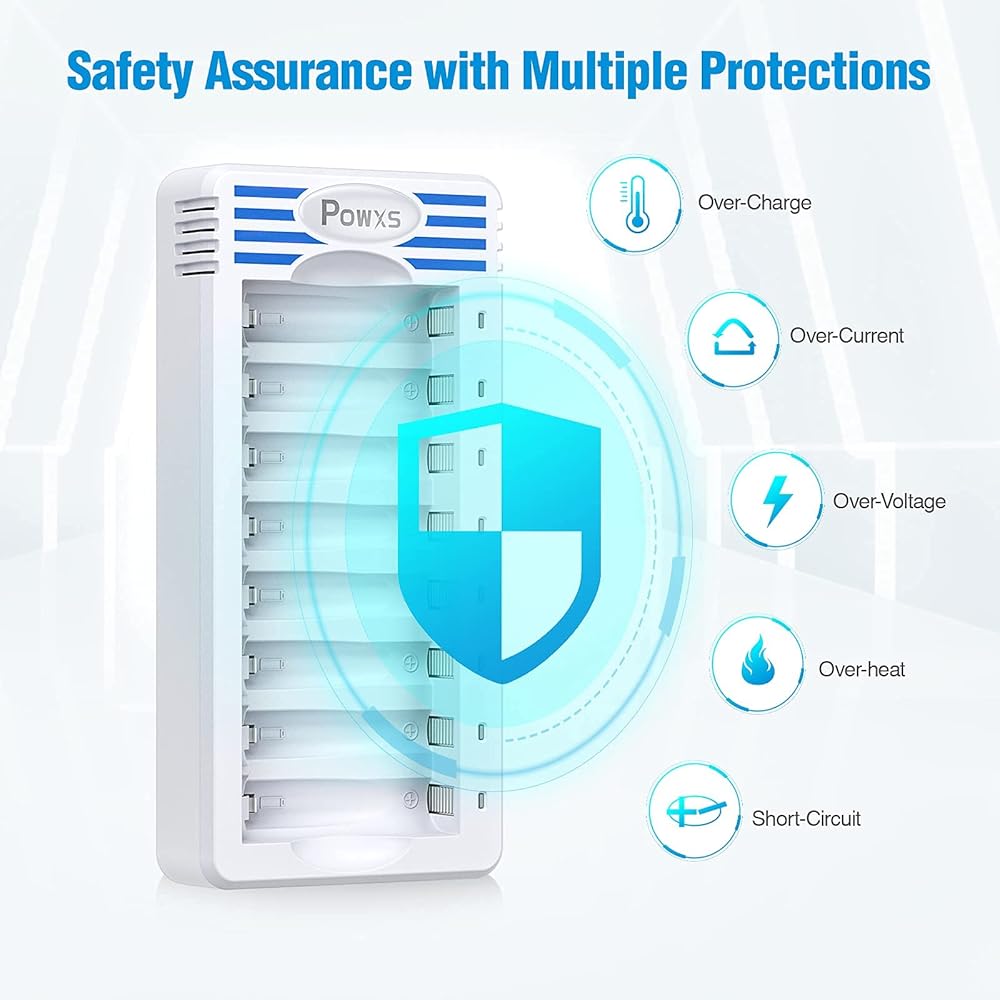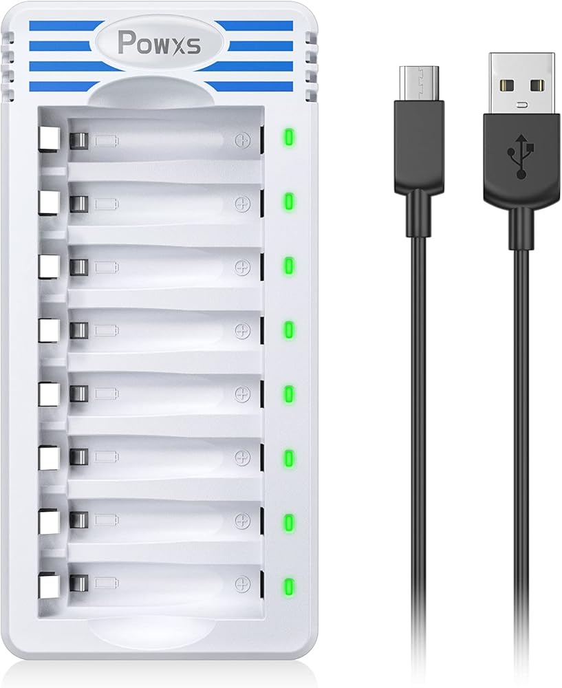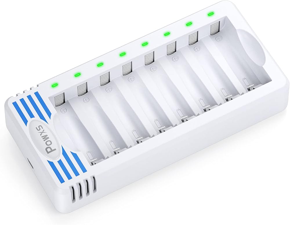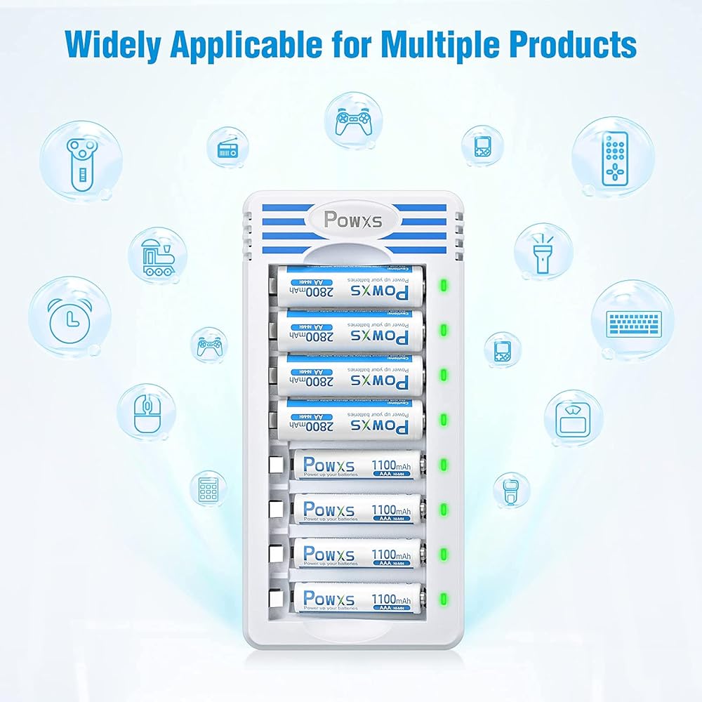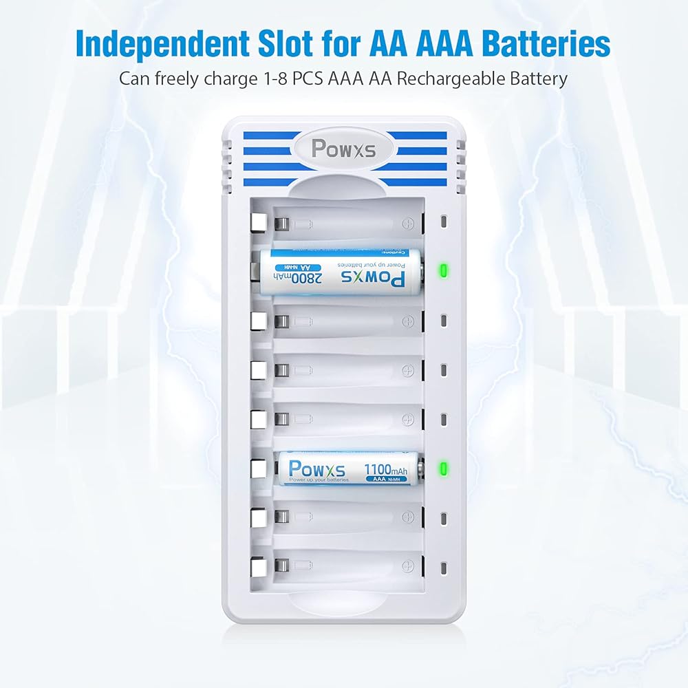 POWXS 8 Bay AA AAA Batteries Charger, Independent and Fast Battery Charger for 1.2V Ni-MH Ni-CD AA Triple AAA Rechargeable Batteries with Convenient USB Cable