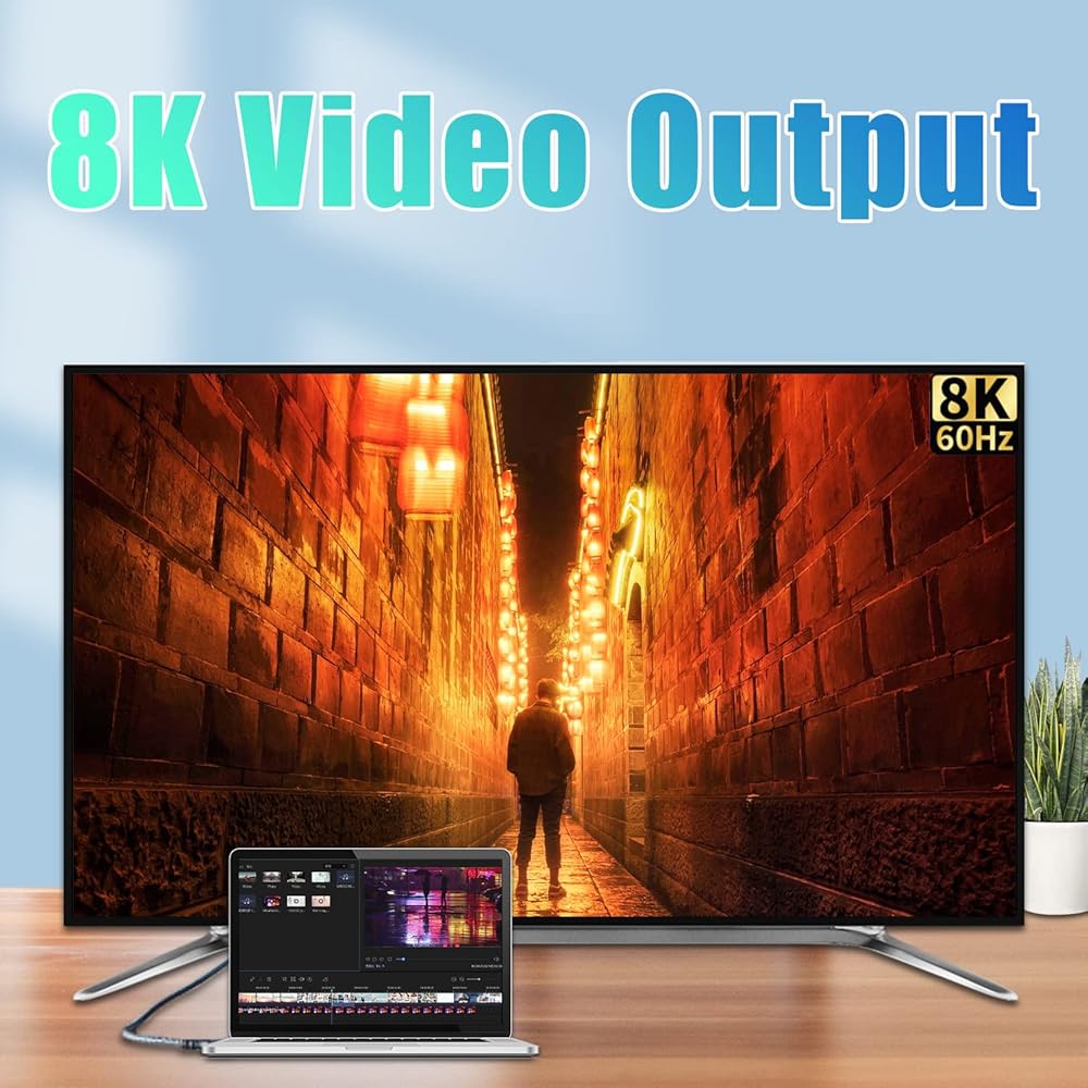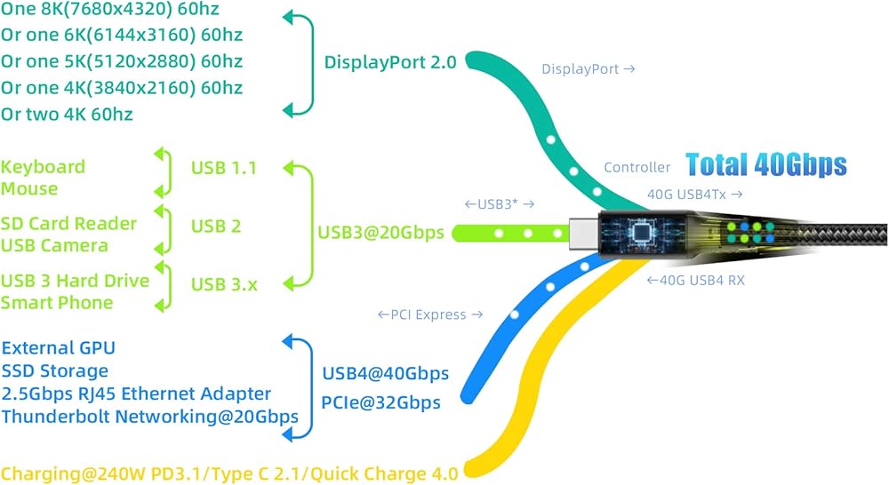 Transmission capacity - Total 40Gbps (gigabits per second). For example, PCIe up to 32Gbps, External SSD read speed up to 3000MB per second, Thunderbolt Networking speed up to 20Gbps, 8K@60hz or dual 4K@60hz Video.