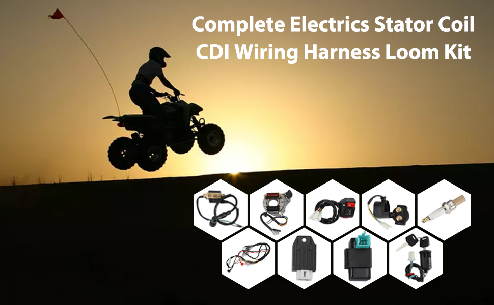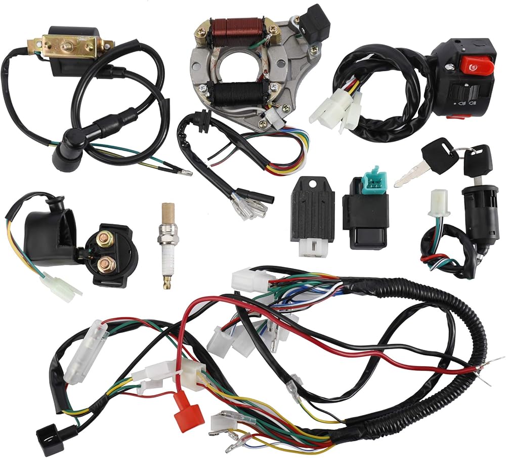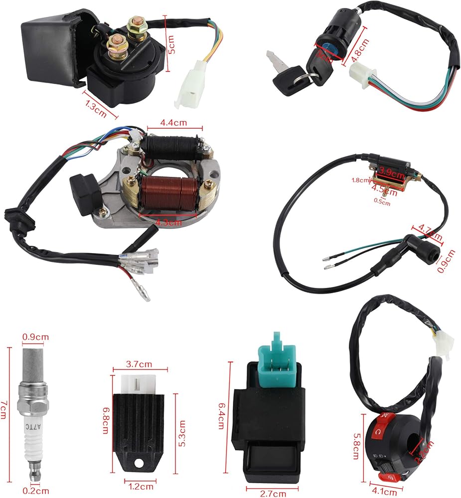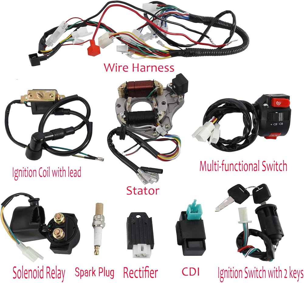 【Electric Wiring Harness Kit】: A complete set of electric starter coil wiring harness kit, includes a Wiring Harness, a CDI(5Pin AC), a Spark Plug, an Ignition Coil with Lead, a Solenoid Relay, a Rectifier, an Ignition Switch (2 keys, waterproof), an Upgraded Multi Functional Switch and a Stator (magneto generator).
