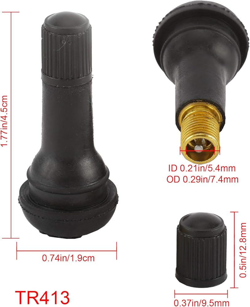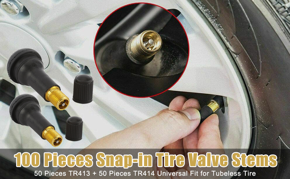 【Applications】: Package includes 50 pieces TR413 + 50 pieces TR414. The Valve Function - Inflate and deflate the tire, and maintain the air seal of the tire. This valve stem kit is widely used for car and motorcycle and electric vehicle tubeless tire etc.