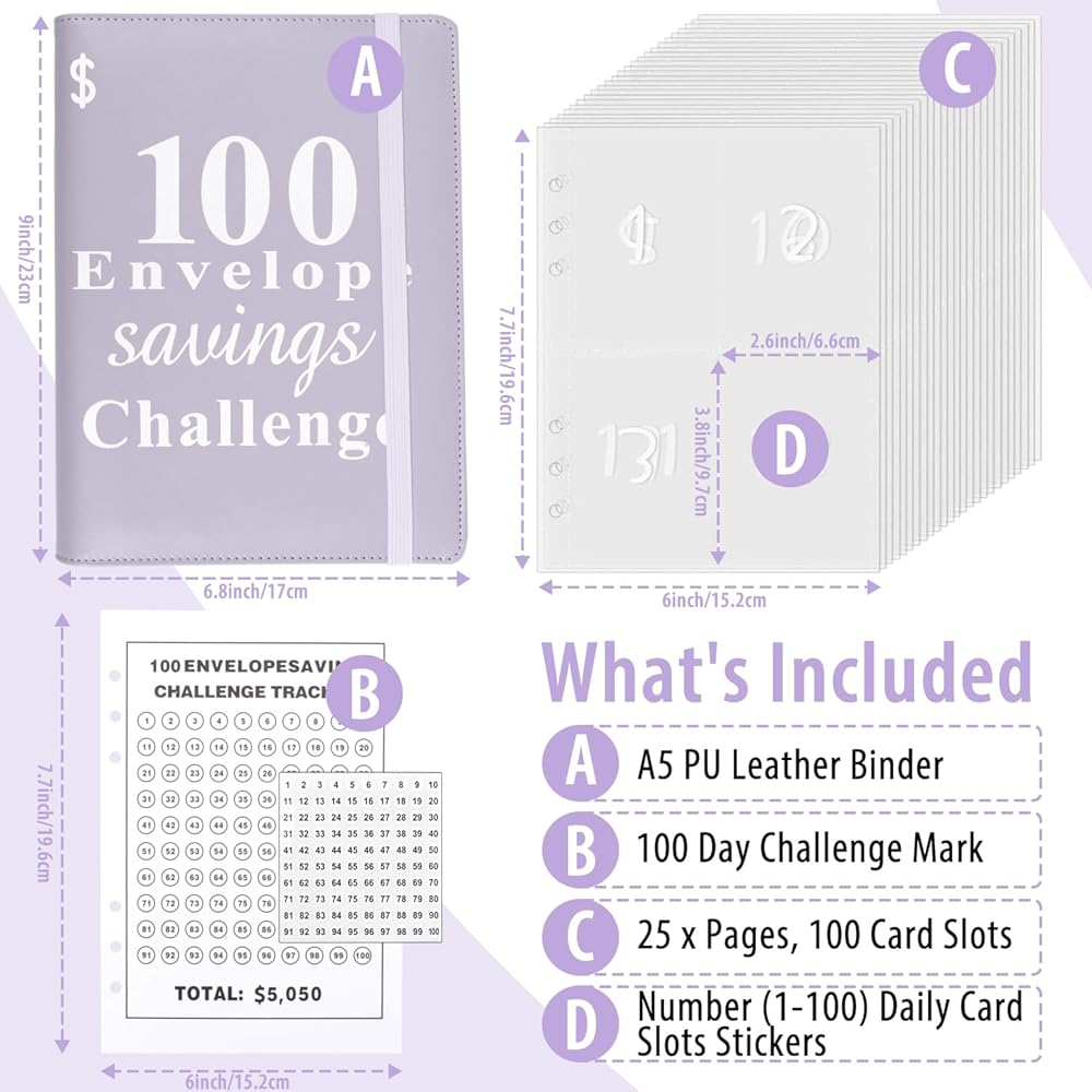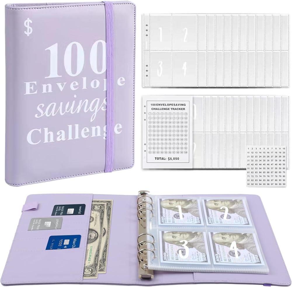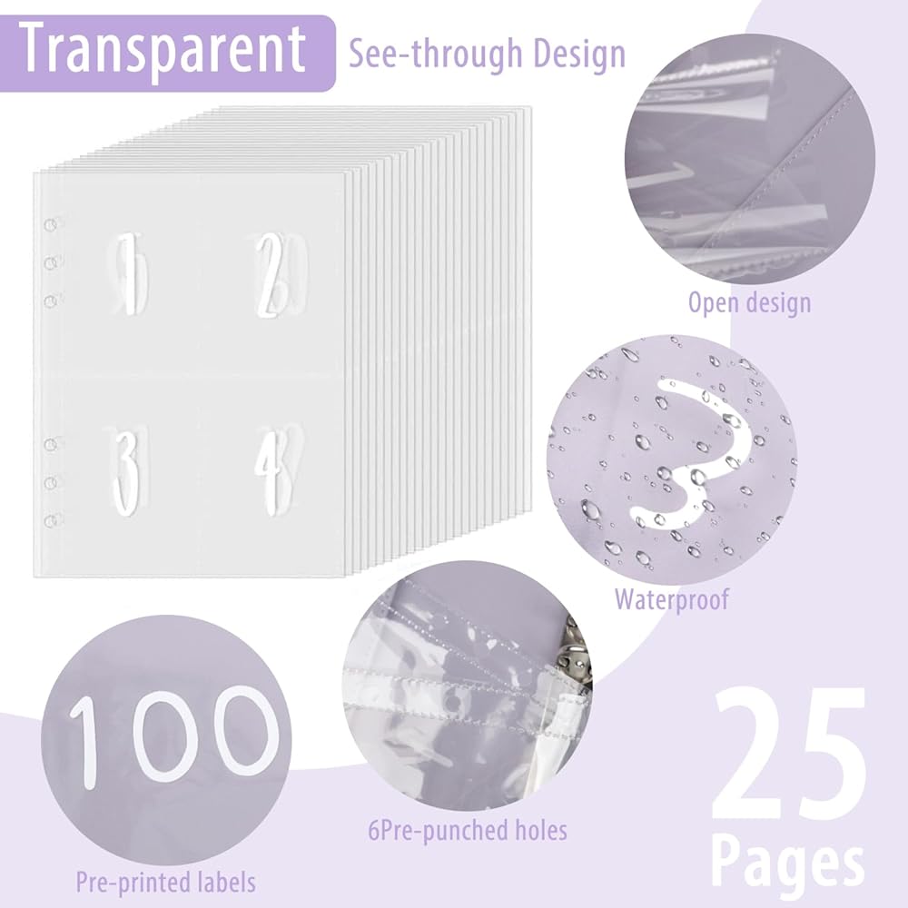 💸𝐏𝐫𝐞𝐦𝐢𝐮𝐦 𝐌𝐚𝐭𝐞𝐫𝐢𝐚𝐥:1 PU leather A5 binder, with a money saving tracker for labeling and 25 transparent cash envelopes pre numbered 1 to 100. It can help you establish an emergency savings fund and cultivate savings habits and effectively manage your finances throughout the entire money saving challenge.