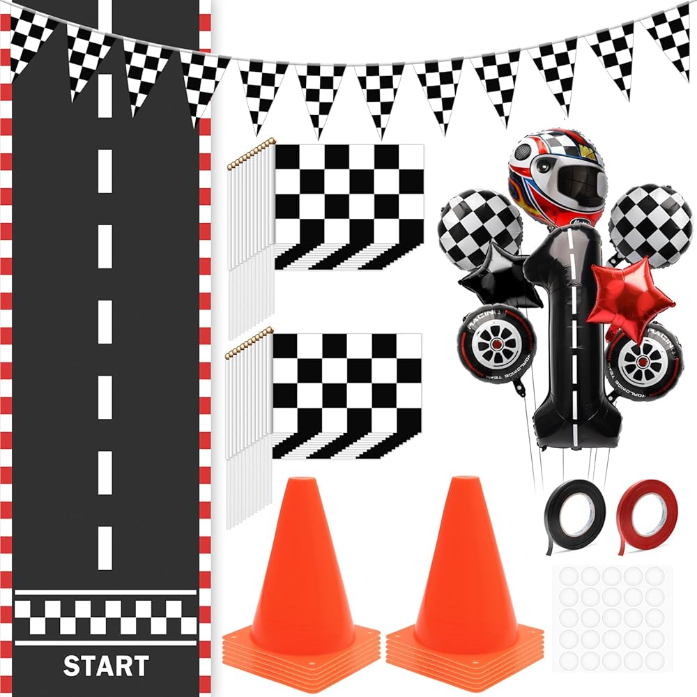 ❤[Luxury Set]: The race car party decorations include 24pcs checkered flag, 12pcs plastic traffic cones, a racetrack floor running mat, and a hanging checkered flag. 38 Pcs in total, such a complete combination, you are worth having.