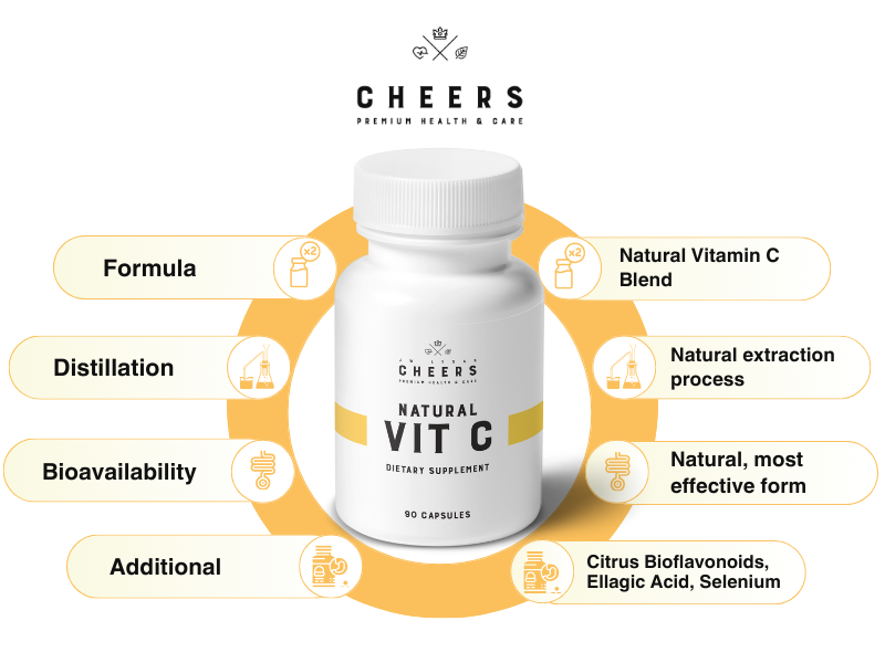 Experience Optimal Immune Support - Cheers Vitamin C is sourced from the best, most natural sources. Our vitamin C tablets contain rose hip, grapefruit and acerola extracts, with fruit-based bioflavonoids that benefit your body. Our capsules do not contain synthetic ascorbic acid, making them safe and gentle on the stomach.