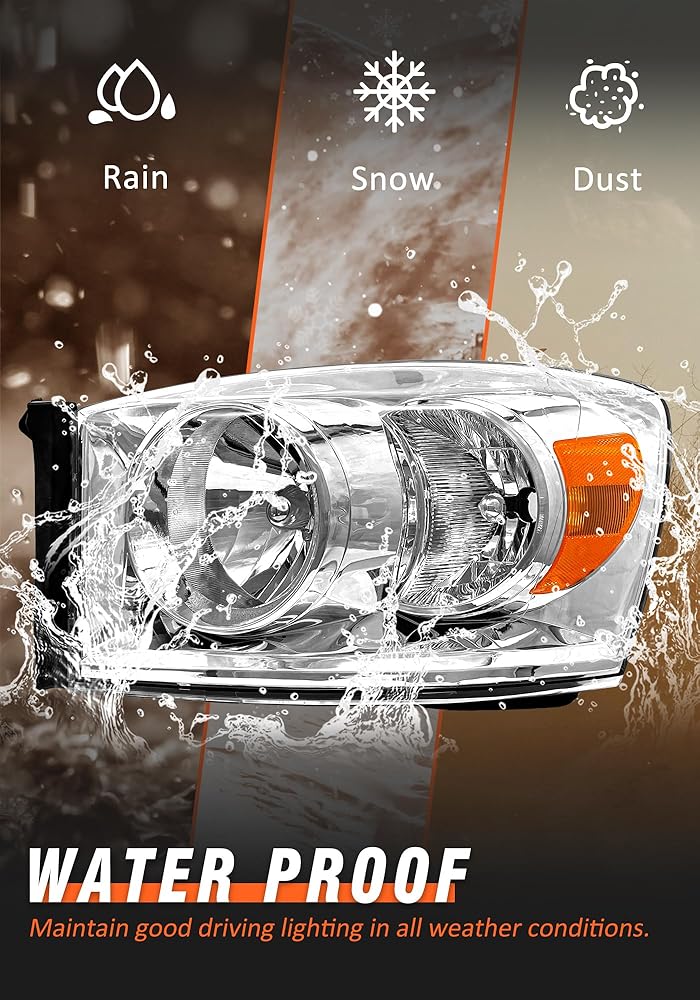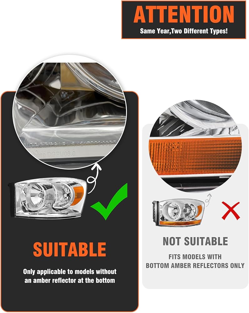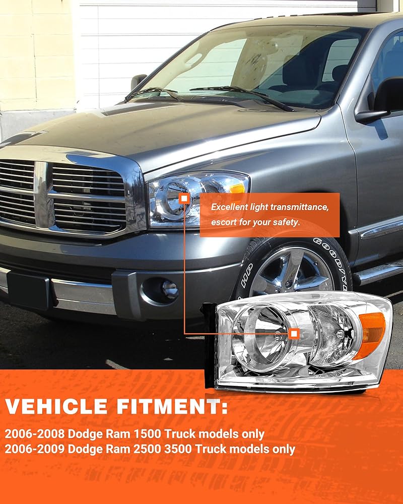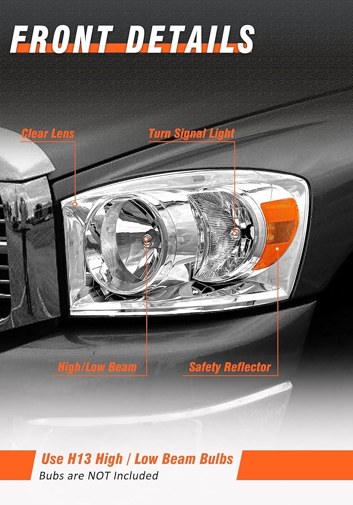 Vehicle compatibility: Headlight assembly compatible with 2006-2008 Dodge Ram 1500/2006-2009 Dodge Ram 2500 3500. High/Low beam:H13,Turn signal beam:3157A(Bulbs not included)