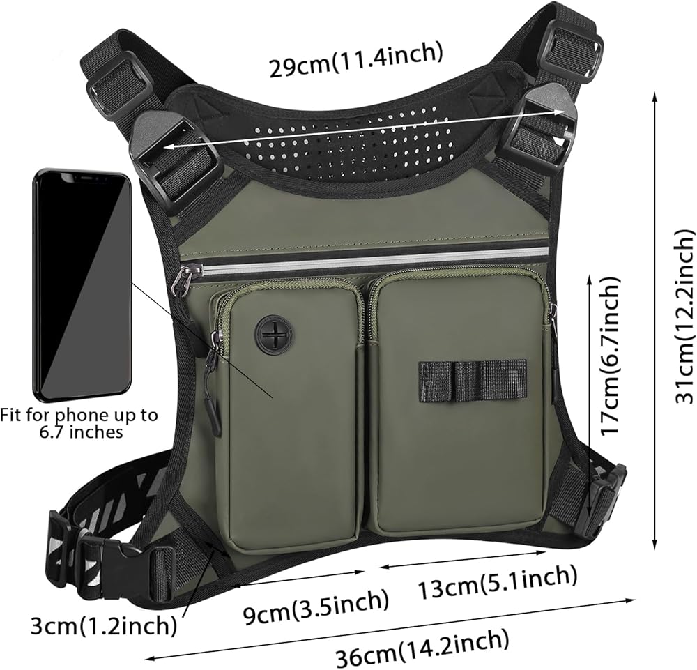 【Spacious & Lightweight】- With a size of 14.2" x 12.2" x 1.7" and weighing only 0.82lb, this running chest pack provides ample space while being super lightweight. The three front zipper compartments are designed for easy organization and quick access to edc gadgets like your wallet, phone, battery charger, keys,notepad,small tablet etc.