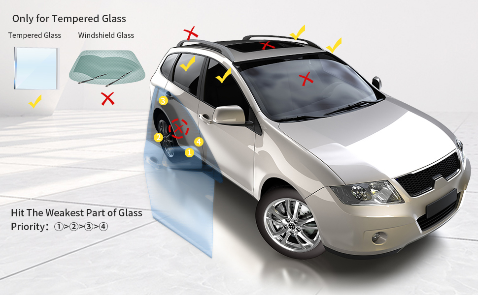 Note: Only available for the tempered glass of the side of the car can be broken, and the car windshield glass or bulletproof glass cannot be broken.