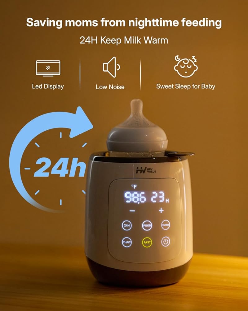 24H THERMOSTAT SYSTEM: Heyvalue bottle warmer Keeping milk/water warm for 24 hours. The LED display screen shows the preset temperature constantly, allowing you to preset the feeding time during late nights. It makes night-time operation more comfortable and safer.