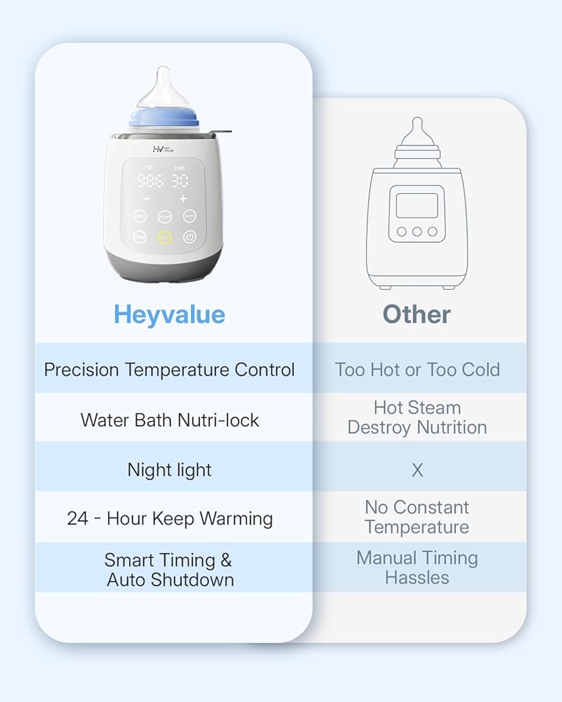 PRESERVES NUTRIENTS IN BREAST MILK: The Heyvalue bottle warmer for breastmilk uses flowing warm water (NOT hot steam) to gently and evenly thaw and warm breastmilk for a comfortable and natural feeding experience. It keeps original taste and the nutrients that is vital to baby's healthy development.