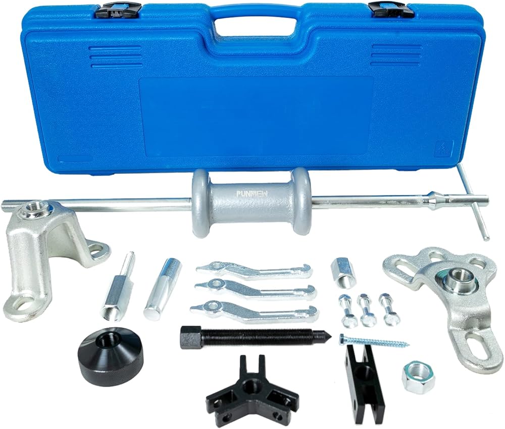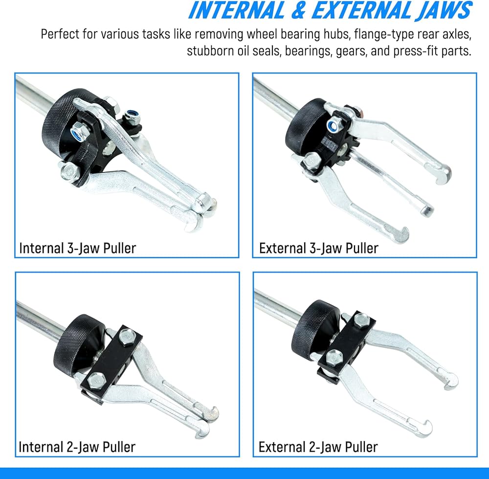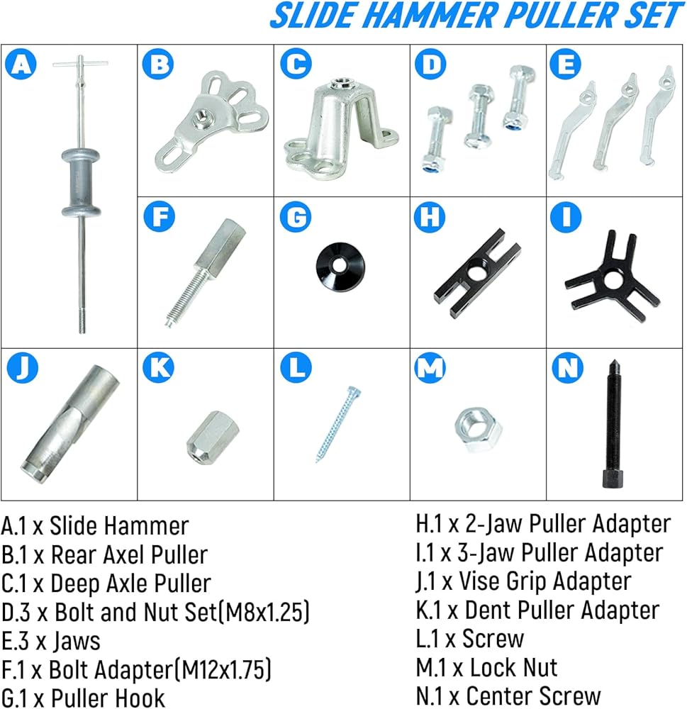 Versatile Auto Repairs: Tailored for aggressive removal of tight parts or dents, the slide hammer features 2 and 3 jaw pullers, a rear axle bearing puller, and other essential tools for various auto body repair tasks.