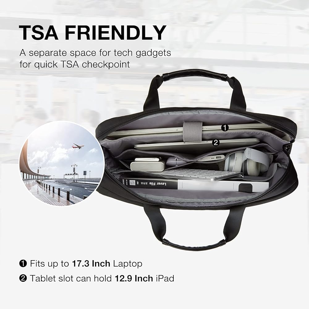 TSA FRIENDLY & ANTITHEFT- Convenient at checkpoint. A separate tech compartment with large opening design can make you quickly pass at airport security, also keeping your 17.3 inch laptop, 12.9'' iPad and other tech gadgets tidy. Its metal anti-theft zippers will enhance the security of the computer bag.