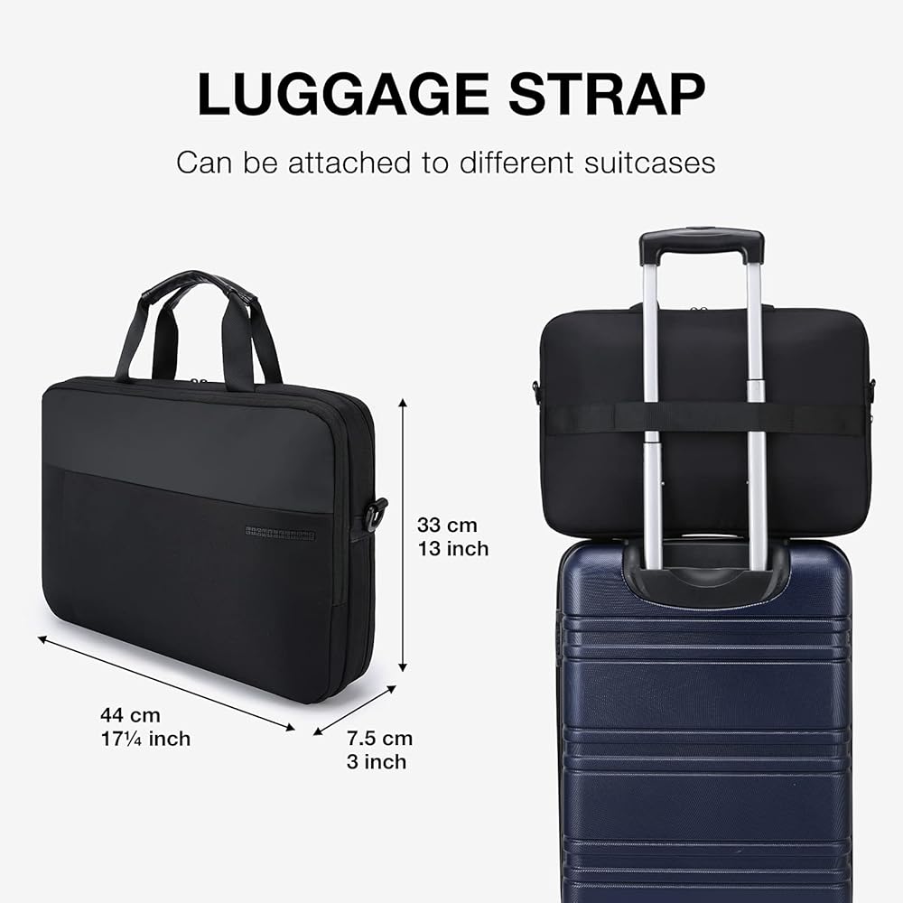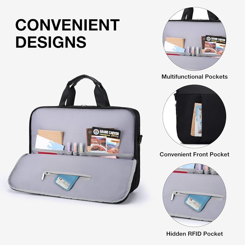 COMFY & ORAGANIZER POCKETS- Adjustable and "C" curve padded ergonomic shoulder strap relieves stress of shoulder; padded vegan leather handles offer light-weight carrying; luggage strap allows laptop office bag to slide over the luggage tube; and lost of organizer pockets aim to ensure a easy business trip or daily commuting.