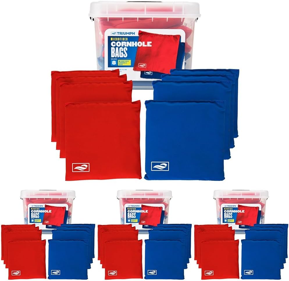 Skip the stress of searching for missing pieces to this classic outdoor game. The Triumph Competition Microfiber Bean Bag Set are the perfect upgrade or replacement bean bags for any bean bag toss game. The four red and four blue microfiber bean bags weigh 12.5 ounces. The 6” square bean bags are durable, allowing you to spend more time enjoying playing with family and friends. When you're finished playing, easily transport and store both sets of bean bags in the included clear plastic storage container with two locking clasps.
