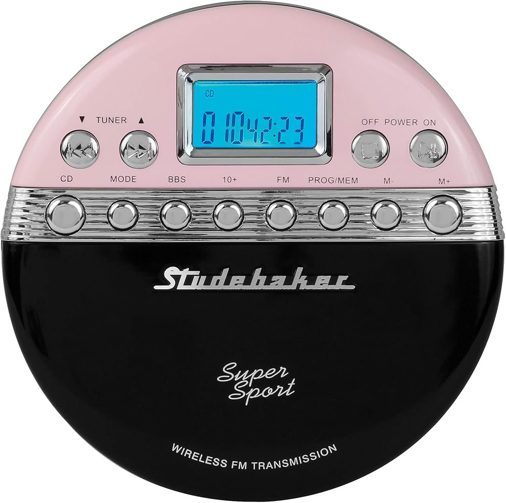 This great looking, fully functional Studebaker Super Sport Retro SB3705PB has everything you would expect in a personal CD player and more. Play CDs wirelessly through your car radio with breakthrough technology. Most newer vehicles do not come equipped with built-in CD players anymore. Now you can play your treasured CD collection through your car radio wirelessly. The unit transmit frequency is preset at 88.1 MHz. Tune your car radio to 88.1 MHz to hear your CD play immediately. If you would like to change this frequency, press the M+ BUTTON/M- BUTTON to adjust the transmission frequency to between 87.5-108 MHz. The transmit frequency will show on the LCD display. Adjust to the same frequency on your car radio. Simple to set up and easy to use, this unit comes with a magnetic holder for attaching your CD player to your car vent. High quality color coordinated stereo earbuds, 60 second anti skip protection, exercise lock switch for locking all the buttons in place, USB and battery (2 x "AA" included) power sources and a host of other features make the Studebaker SB3705PB an outstanding, state-of-the-art personal CD player.