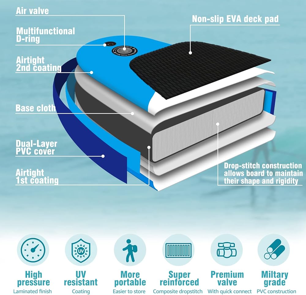 أداء ومتانة أفضل: مصنوعة من مادة PVC عالية القوة معززة ببنية غرز متدلية، مما يسمح لها بالحفاظ على شكلها وصلابتها حتى عند نفخها لضغوط عالية. وسادة مضادة للانزلاق مصنوعة من مادة مطاطية سميكة بما فيه الكفاية لتوفير توسيد مناسب وامتصاص الصدمات، مع السماح للمستخدم بالحفاظ على قدم ثابتة. غطاء PVC مزدوج الطبقة يجعل اللوحة أكثر متانة لأنها لن تتعرض للتآكل أو الاحتكاك عند سقوطها.