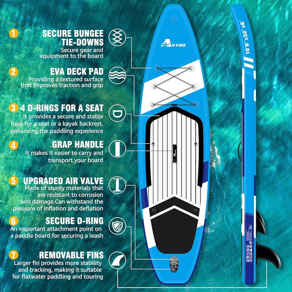قدرة تحكم ممتازة: لوح مجداف قابل للنفخ مزود بثلاث زعانف لتوفير تحكم ممتاز في ركوب الأمواج، سوف تنزلق وتنزلق فوق الماء مثل المخلوقات البحرية! تم تجهيز الزعنفة بجهاز مزلاج، وهو مناسب للتركيب والإزالة في الأوقات العادية، ويمكن أن يوفر توجيهًا وثباتًا أفضل. 4 حلقات على شكل حرف D للمقعد هي ملحق مفيد لألواح التجديف القابلة للنفخ المصممة للجلوس أو التجديف بالكاياك حيث أنها توفر قاعدة آمنة ومستقرة للمقعد.