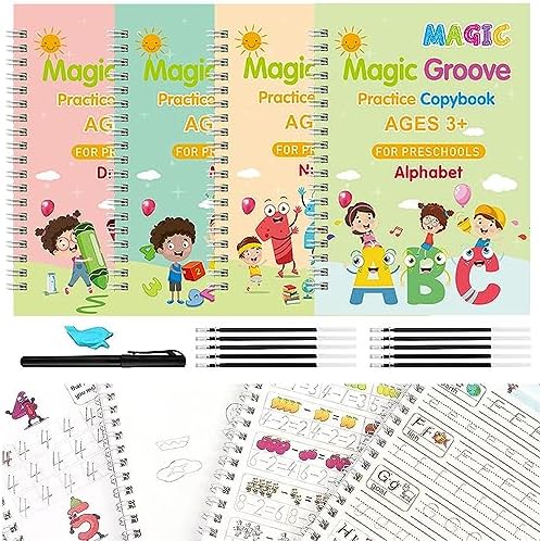 1.Groovd kids writing: Develop kids' own writing style. Grooved Handwriting Book includes 4 English handwriting books, 1 auto-fading pen, 10 refills, and 2 pen holder s.