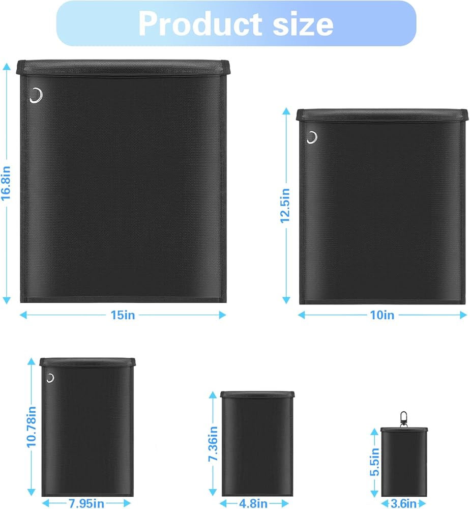 【Multi-size Faraday Cage to Meet Your Needs】Large faraday bag(16.8''x15'') *1, laptop faraday bag(12.5''x 10'') *1, faraday cage For radio(10.78''x 7.95'') *1, faraday bags for phones(7.36''x 4.8'') *1,faraday key fob protector(5.5''x 3.6'')*1-- Our faraday cage bags provide security protection for your credit cards, passports, cell phones, laptop, key fobs, bluetooth, GPS units, transponders.