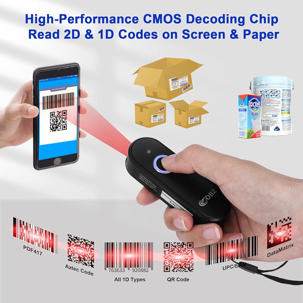 OBZ Mini 2D Bluetooth Barcode Scanner, 2.4G Wireless Barcode Scanner, 3-in-1 Portable Handheld 1D 2D QR Code Scanner Work with iOS Android Windows iPhone iPad Tablet PC POS for Store Inventory Library