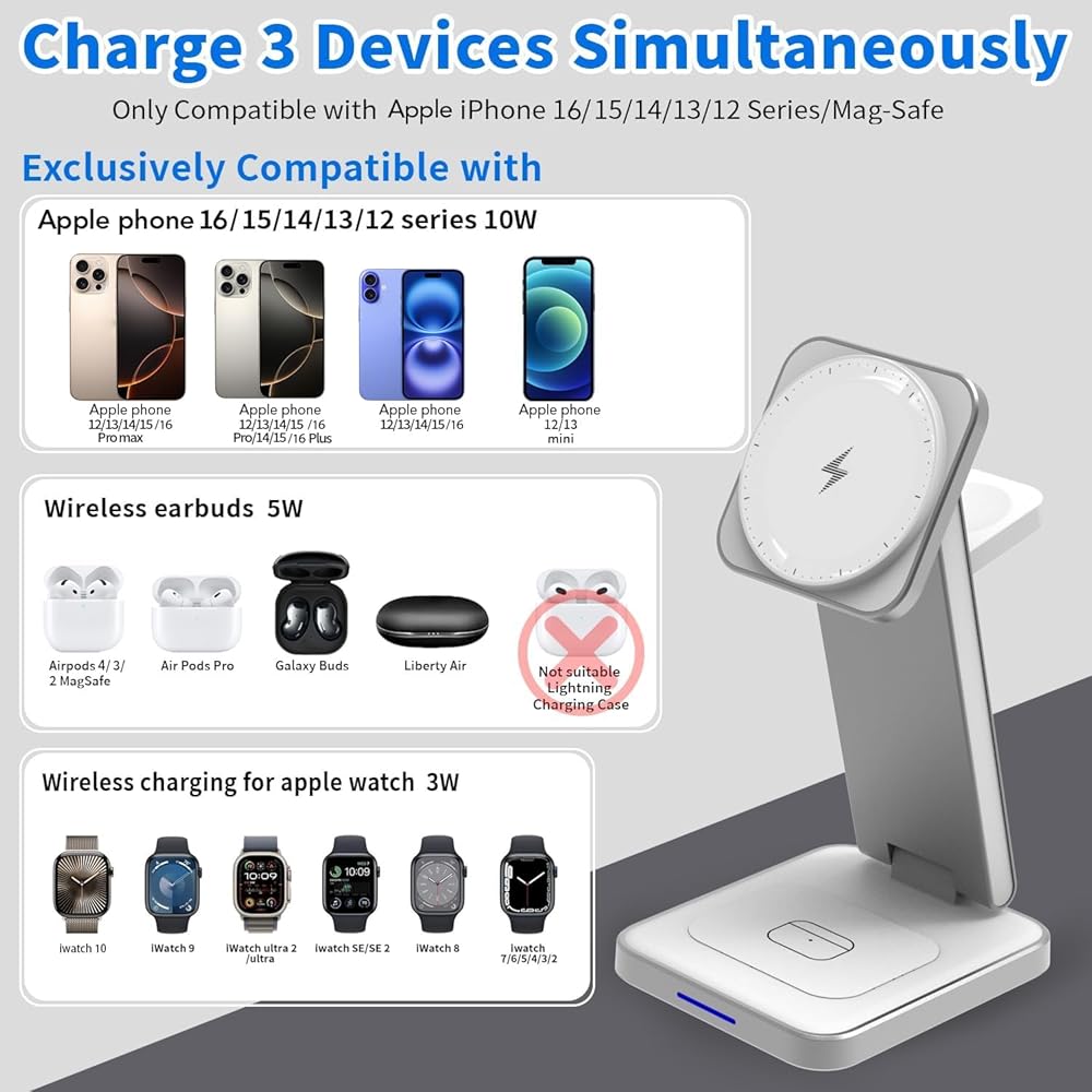 【Foldable Mag-Safe Charger Stand 3 in 1】The magnetic wireless charger is compatible with Apple 15/15 Plus/15 Pro Max/15 Pro/14 pro max/14 pro/14 plus/14/13 pro max/13 Pro/13/13 mini /12 Pro Max /12 pro/12/12 mini and iWatch 9/Ultra 2/8/Ultra/SE/SE 2/7/6/5/4/3/2, Air-pods 3/2 Mag- Safe version, Air-pods pro..Note: Not for others smart watches. Not for the Air-pods 3/2 Lightning version.(QC3.0 Adapter is included)