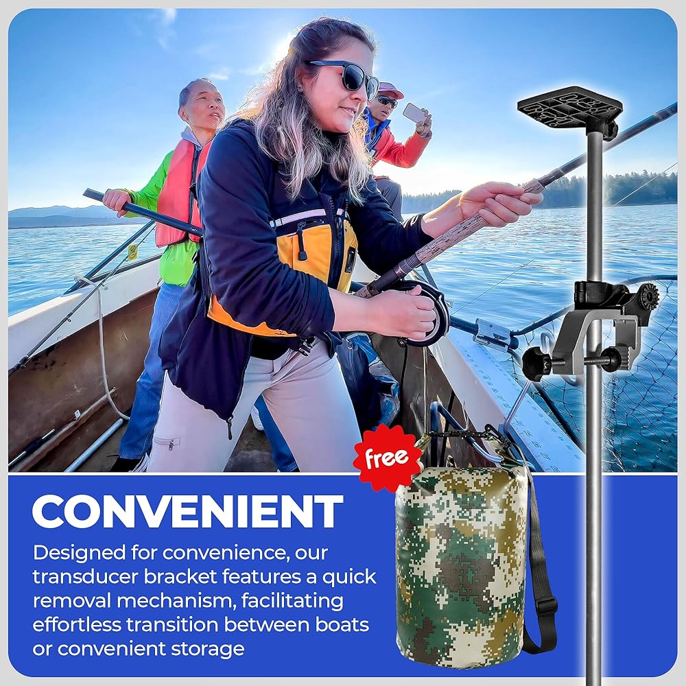 VERY CONVENIENT: Designed for convenience, our transducer bracket features a quick removal mechanism, facilitating effortless transition between boats or convenient storage when not in use, optimizing your fishing trips with hassle-free convenience.