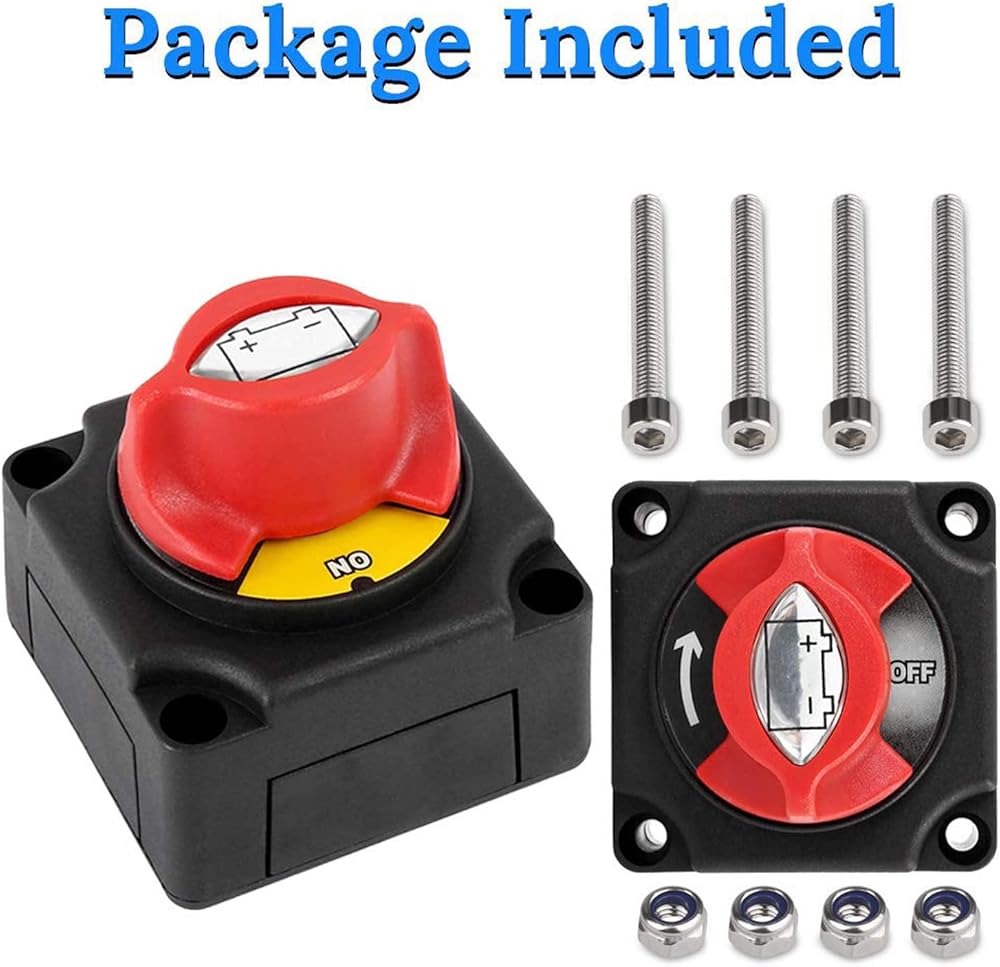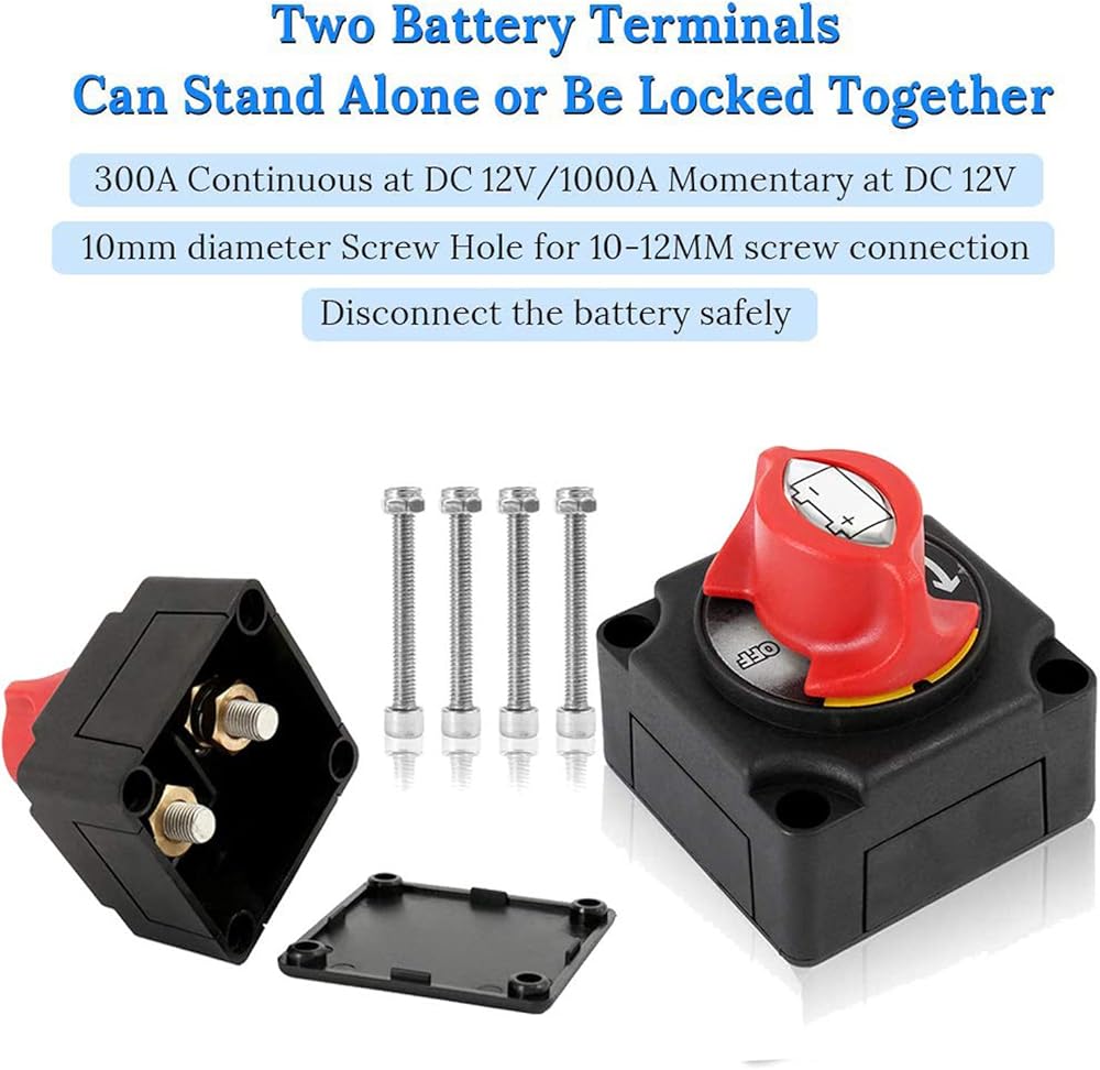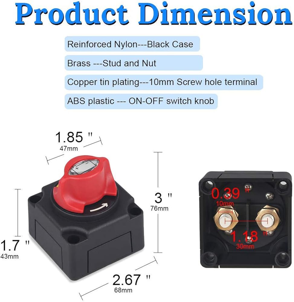【Heavy Duty】Battery shut off switch comes with 1-2-both-off 4 positions,200 A continuous at DC 12V, 455 A Intermittent at DC 12V, 1250 A momentary at DC 12V,3 mounting screw holes(8mm diameter)for 8-10MM screw connection (not included mounting hardware)