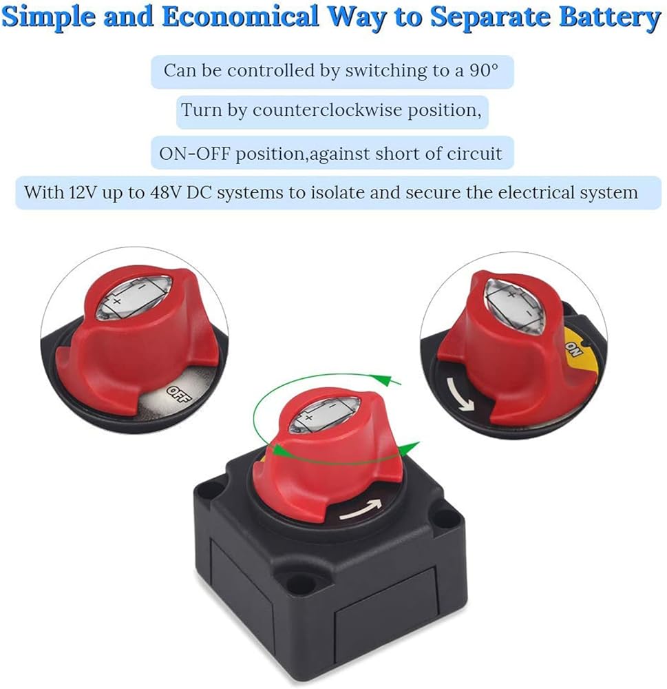 【Great Compatibility】This dual Marine battery switch is Suitable For Two Batteries, It can stand alone, or be locked together with other switches to isolate and Can be used with 12V up to 60V DC systems to isolate and secure the electrical system,Offering a simple economic way of separating two batteries.