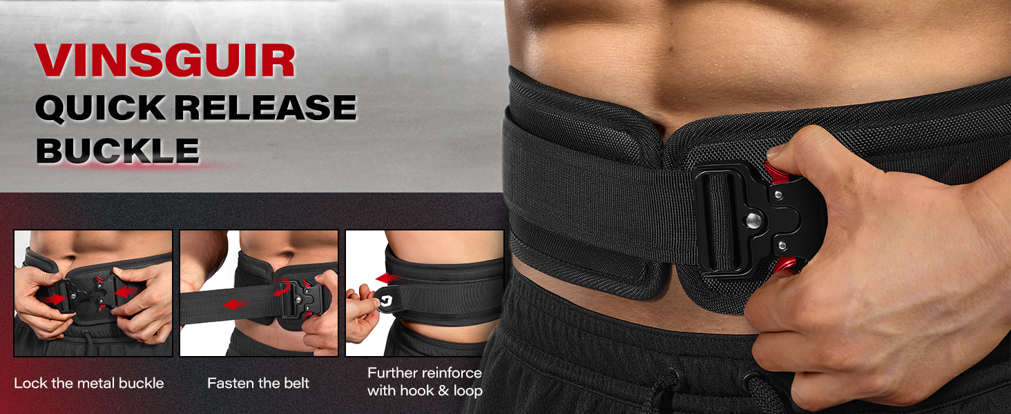 Effortless Quick Release: The Vinsguir lifting belt features a heavy-duty quick-lock metal buckle for hassle-free adjustments. Just a simple press ensures a secure fit or swift release, while the adjustable workout belt with a durable hook-and-loop fastening guarantees your perfect fit, ensuring maximum comfort.