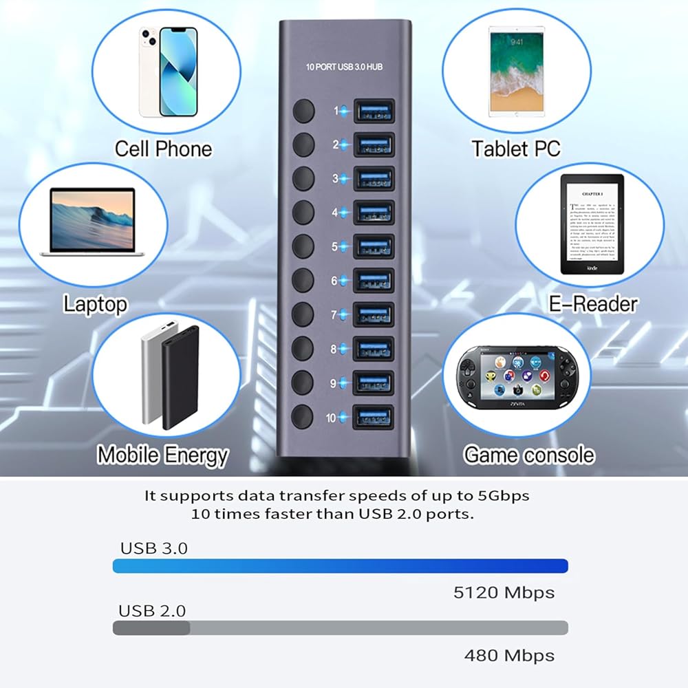 【Charging and Data transmission】The 7 port USB3.0 hub owns 4 blue hub ports, 2 red usb charging ports, and 1 PD output port. Multiple USB 3.0 ports with a data transfer rate of up to 5Gbps can save you more valuable time.