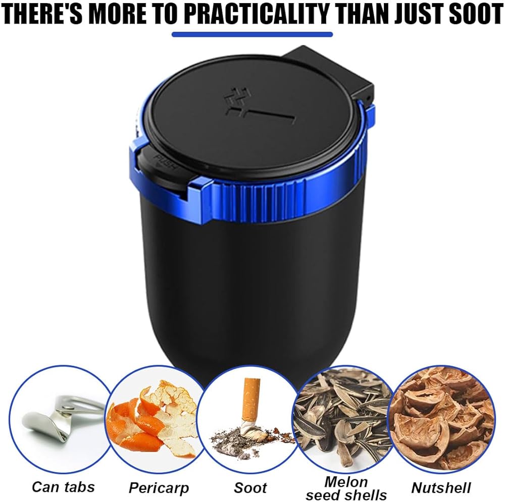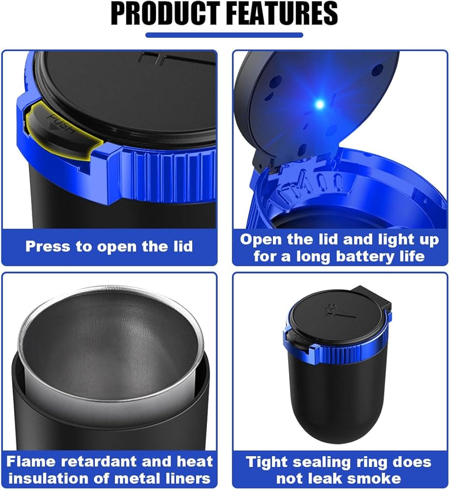 【LED Light Design】:The car portable ashtray has a built-in soft blue LED light, when the lid of the ashtray is opened, the small blue light will light up to illuminate the ashtray, so you can easily see and observe the inside of the jar in the dark.