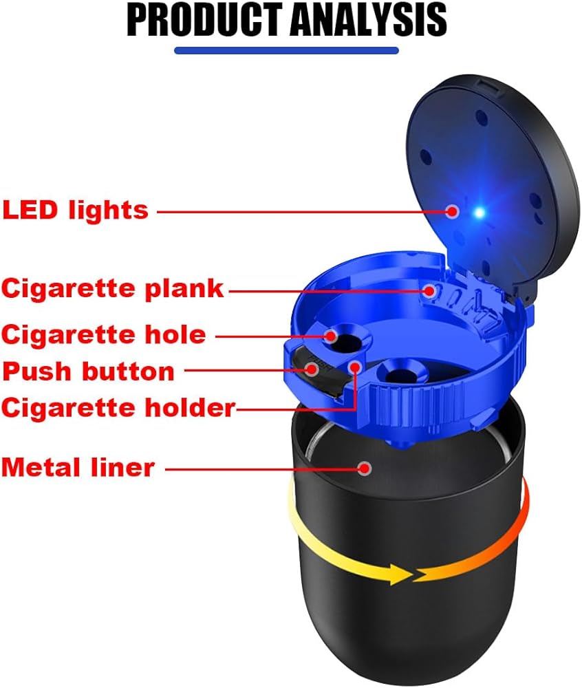 【High-Quality Material】: The car LED ashtray is made of a high-quality ABS shell and metal inner liner, sturdy structure, good sealing, durable, anti-scald and flame retardant, safe and reliable, not easy to break or wear out for long-term use.