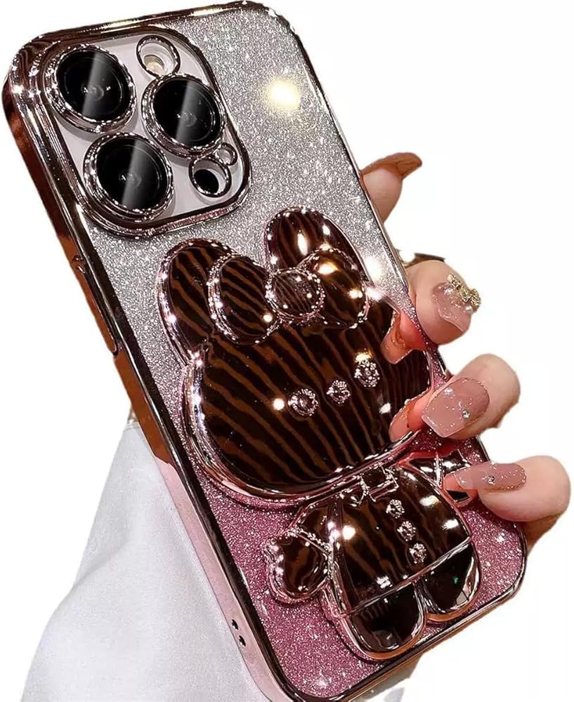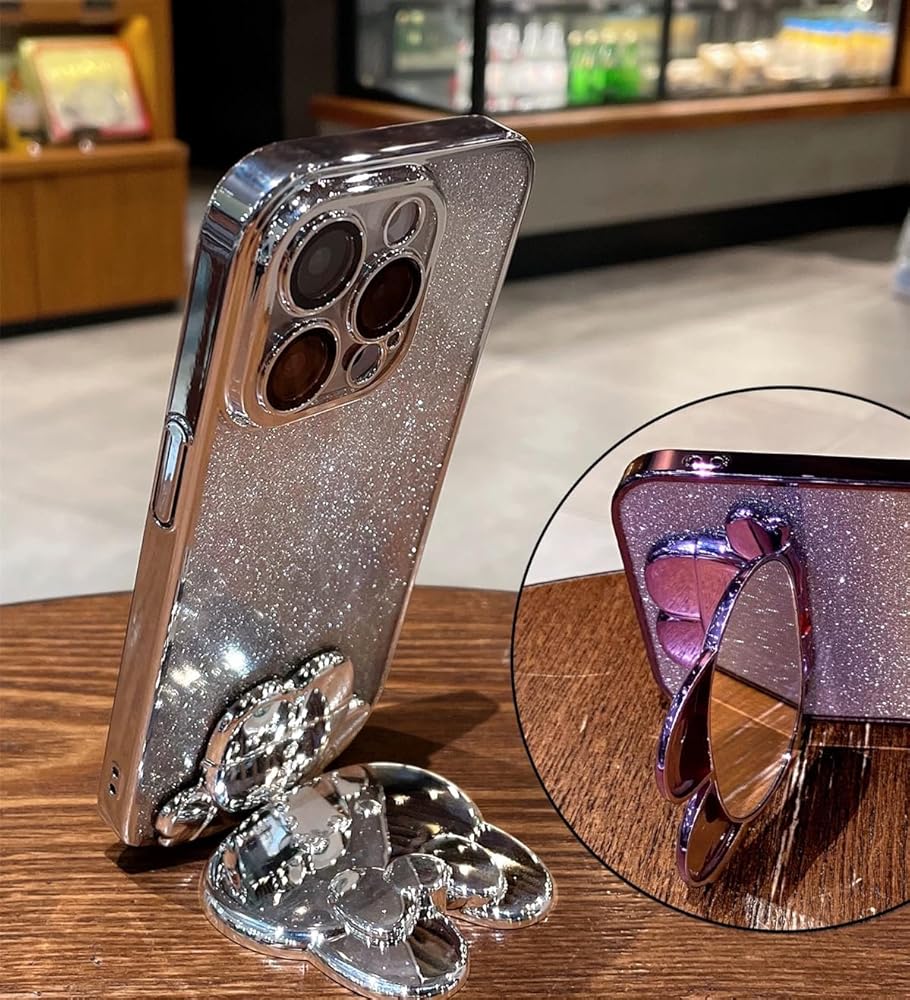 iPhone 16 Plus Case for Women Girls Cute Hidden Rabbit Mirror Kickstand,Luxury Plating Soft TPU with Bling Gradient Layer,Glitter Girly Phone Case for iPhone 16 Plus Pink