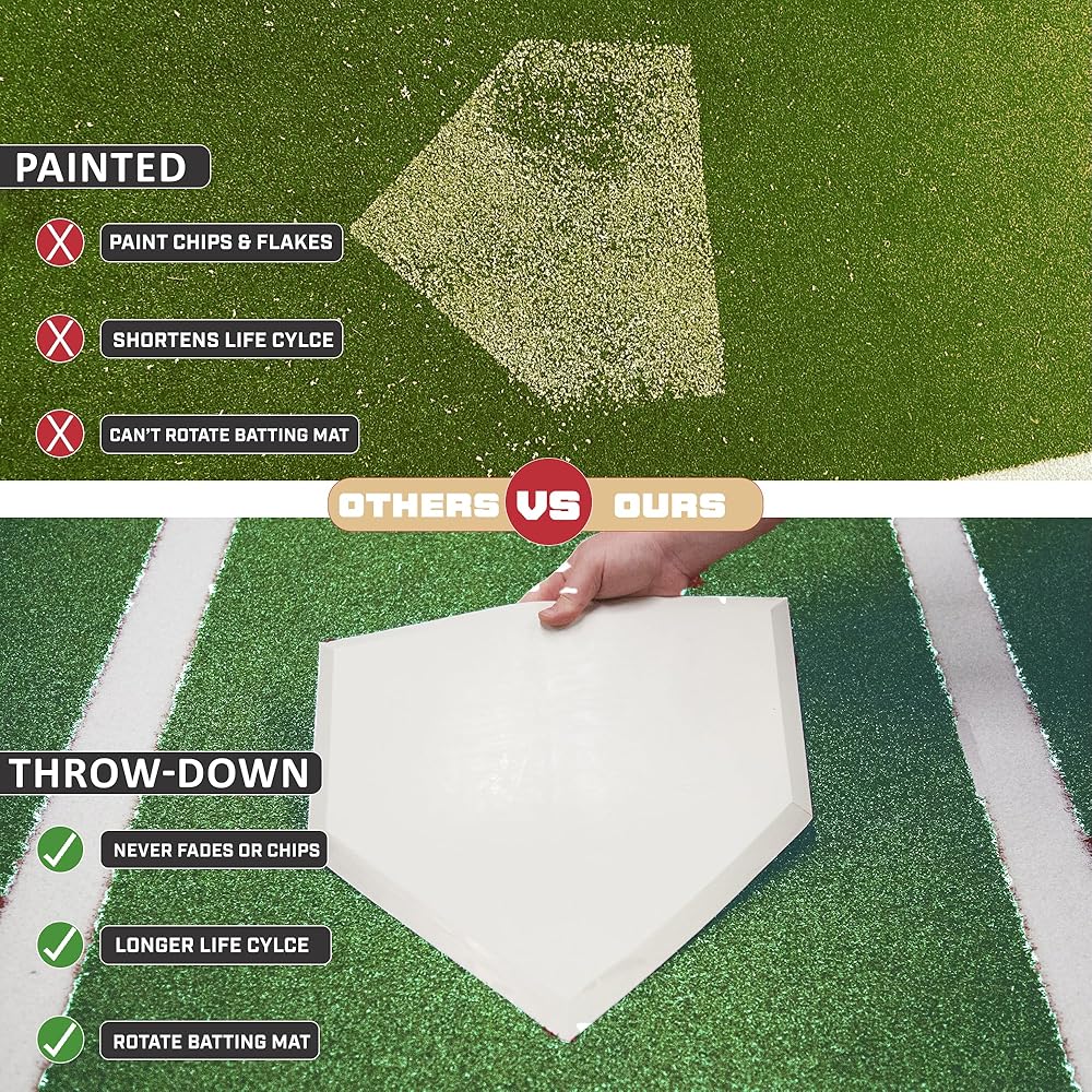 DESIGN: Green colored batting mat with 5mm foam backing and inlaid white batters box lines comes with a throw-down home plate, allowing the batting mat to be rotated for even wear - extending the life of the batting mat which can also be easily stored
