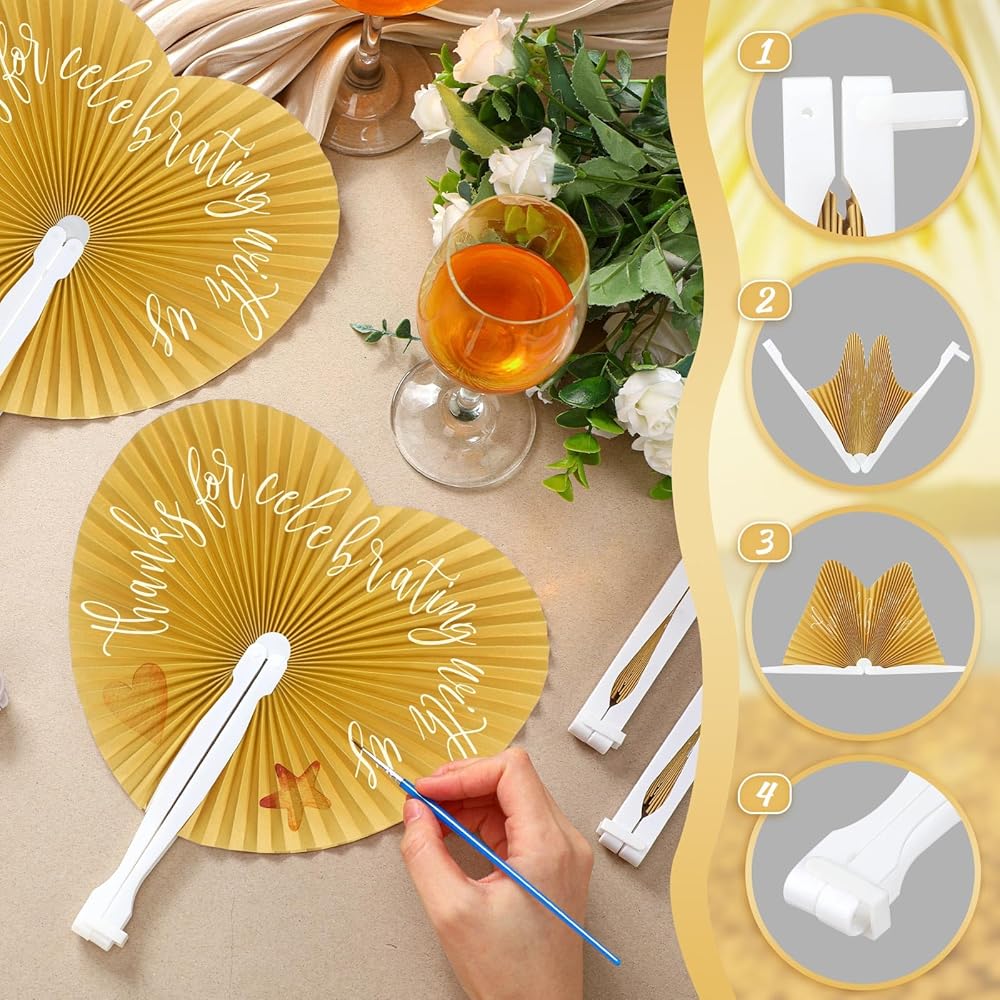 Pinkunn 120 Wedding Favors Fans Wedding Handheld Folding Fans Bulk Thanks for Celebrating with Us Bridesmaid Gift for Bridal Dancing Props Photo Props Church Anniversary Party(Gold,Heart)
