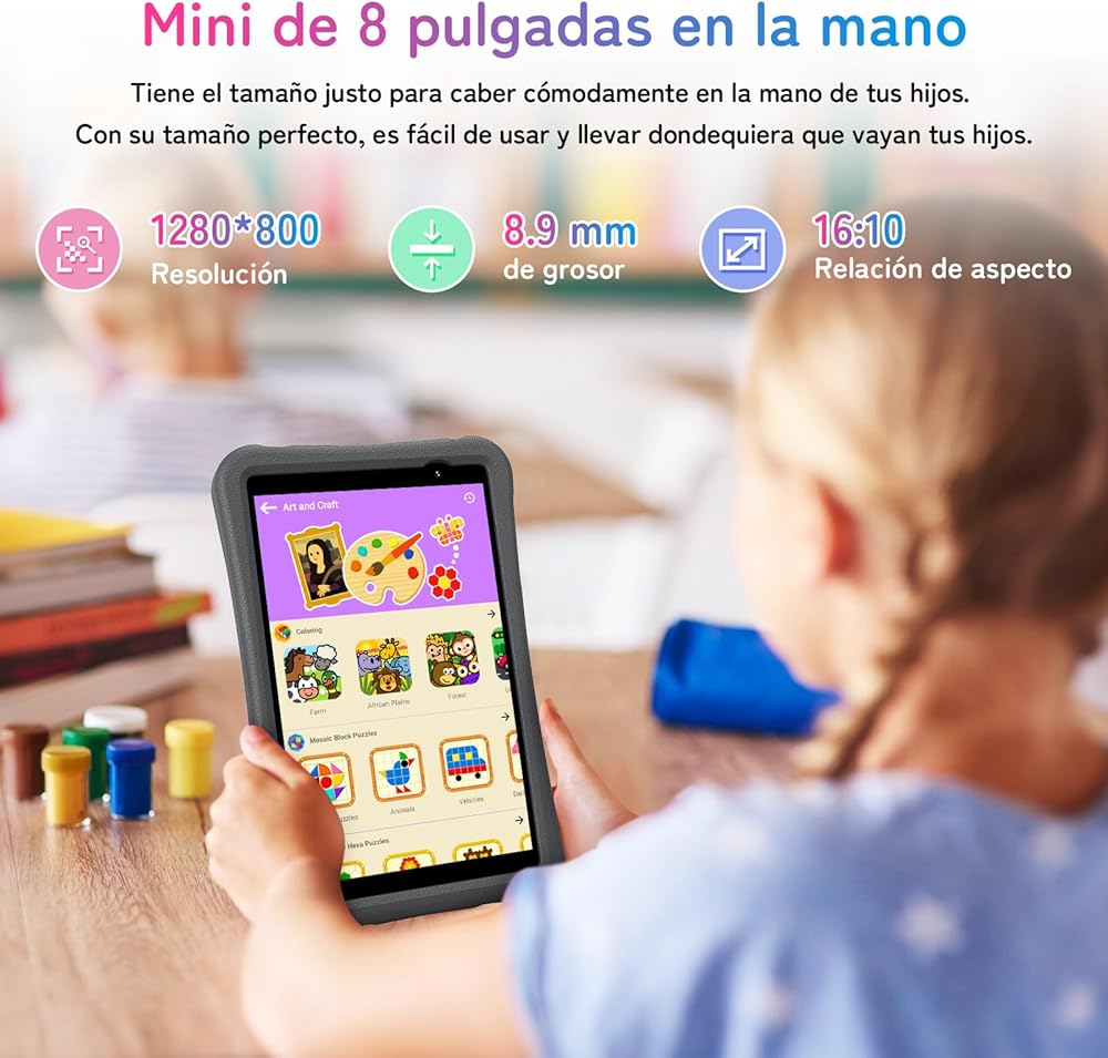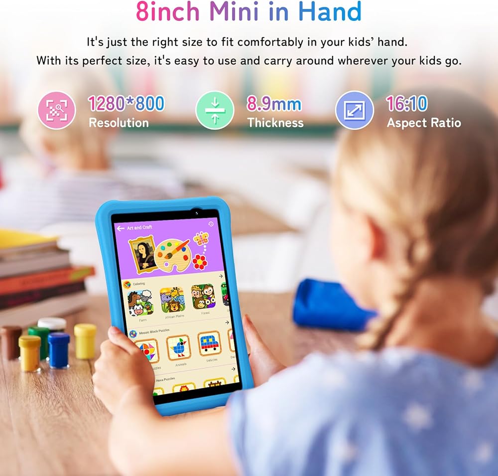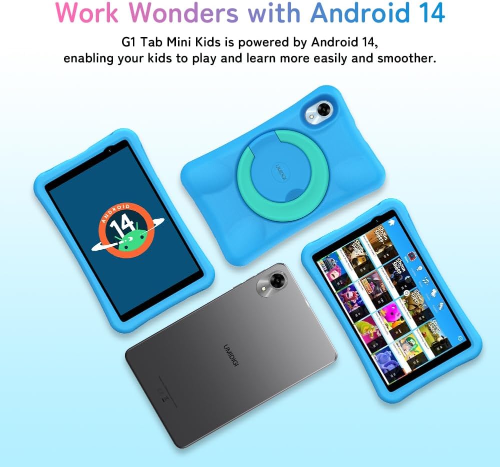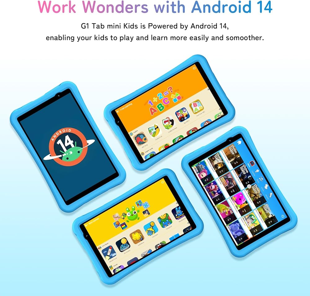 🚀🚀【Latest Android 14 & Super Fast Wi-Fi 6】G1 Tab Mini Kids is powered by latest Android 14, enabling your kids to play and learn more easily and smoother. This kids tablet with rapid Wi-Fi 6 connectivity, your kids can stay linked at home, work, or school. Whether downloading homework streaming videos, online learning, or game playing every thing happens in a flash.
