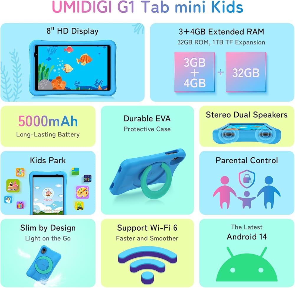 💖💖【Parental Control System & Fun Time with KidsPark】UMIDIGI Kids Tablet is pre-installed with KidsPark APP, which offers over 100 educational and interactive games covering themes to inspire children to explore their world and expand their horizons. UMIDIGI Android 14 Kids Tablet designed for children, who ages 3-12 to develop their skills and imagination. Multiple accounts are supported, so each child can have their own personalized experience. Exiting the KidsPark APP is a general mode that can be used by adults as well.