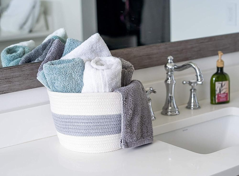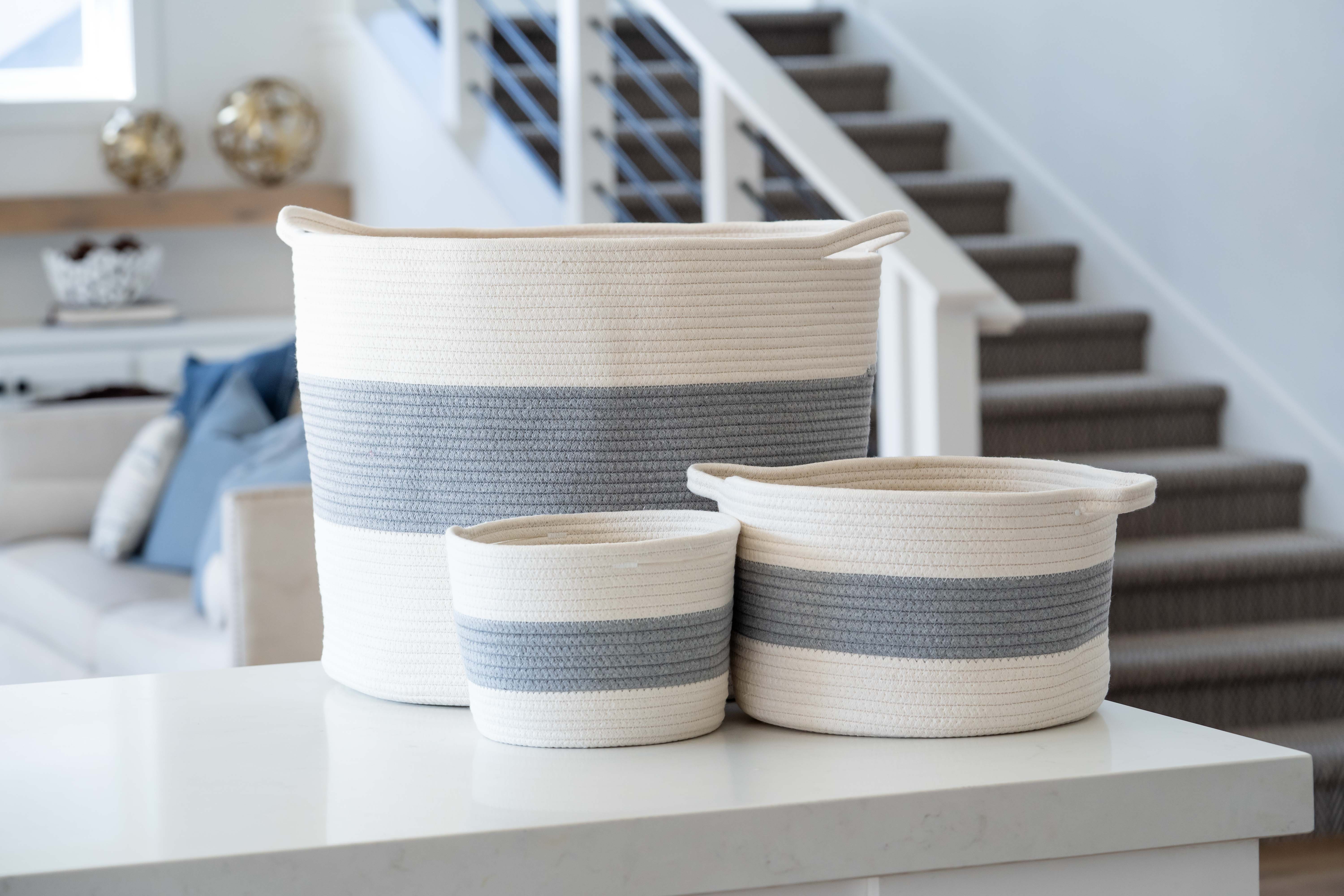 ✅MODERN, TWO-TONE DESIGN MATCHES ANY DECOR: Who says you have to settle for loudly colored toy baskets that don't match a single piece of furniture in the house? Our chic grey and white large storage baskets seamlessly blend into any laundry room, decorate any bedroom, bathroom or living room space, and can double as a cute pot cover for your plants. With major minimalist vibes, they're the perfect compliment to modern, rustic, bohemian, farmhouse, hippie, vintage or marine room decor!