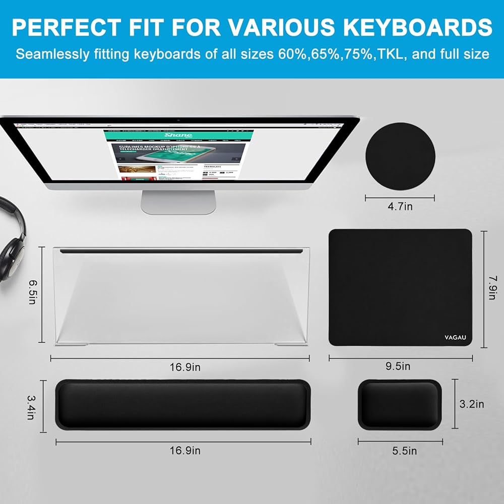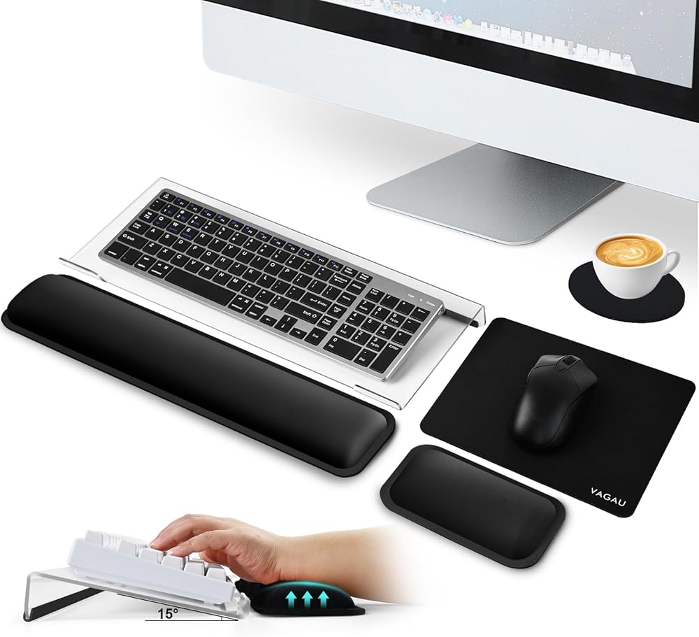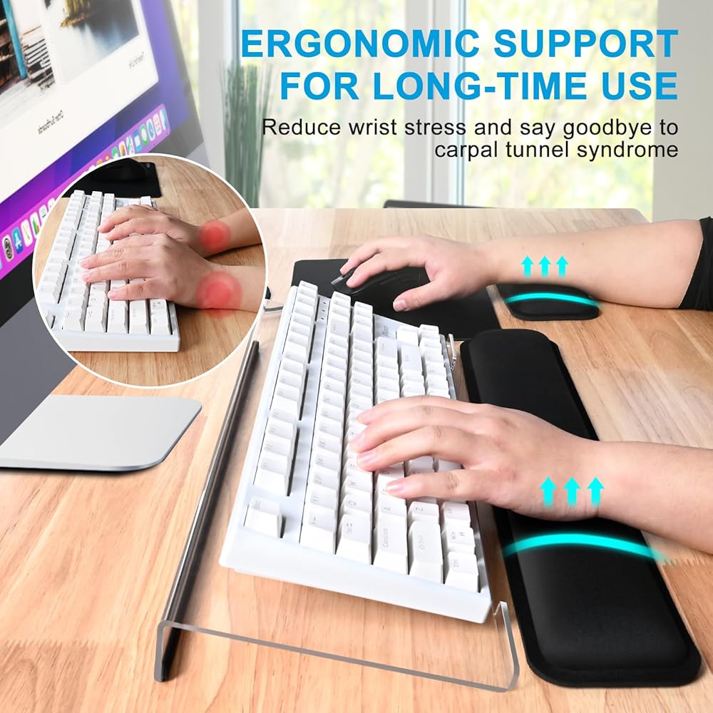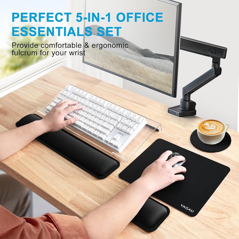 【5-in-1 Ultimate Cost-Effective Office Desk Accessories Set】Includes Acrylic Keyboard Stand + Keyboard Wrist Rest + Mouse Pad + Mouse Pad Wrist Support + Coaster. Perfect for workers/gamers/writers who have been typing for a long time to relieve wrist and hand fatigue. The perfect office essentials set.