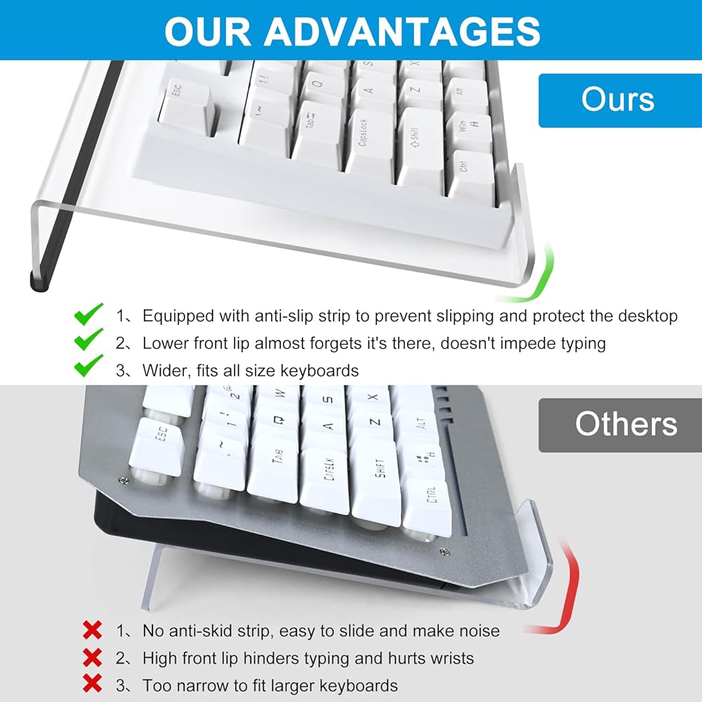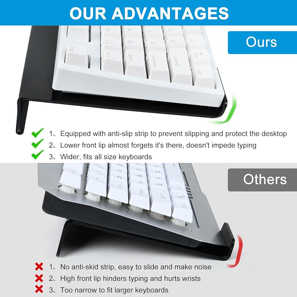 【Perfect Larger Size for Various Keyboards】The keyboard stand are made of drop-resistant and scratch-resistant high-quality acrylic material for durability and smooth, polished finishes. Its acrylic touch seamlessly blends in with your computer desk accessories. Seamlessly fit all sizes of keyboards - 60%, 65%, 75%, TKL and full size. The stand measures 17.0 x 6.5 x 1.57 inches.