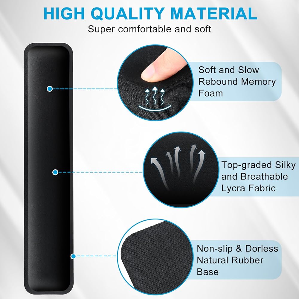【High Quality Comfortable Material】The wrist rest are made of improved super soft, smooth and breathable Lycra fabric, which are non-irritating to the skin. Breathable and not easy to heat up. Filled with comfortable memory foam, have slow rebound and not easy to deform. Provides lightweight, comfortable, durable and ergonomic touch, ideal for long-time use.
