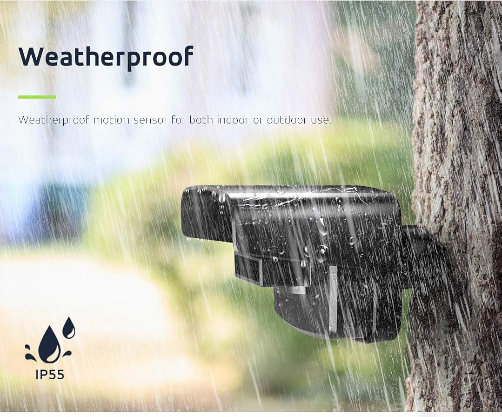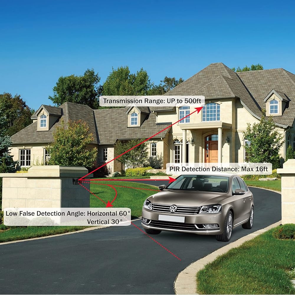 【Ultra Reliable Motion Sensor】This PIR Motion Sensor detection range is 16ft, 60 angle, it is the perfect range to reduce false alarm. When a person, vehicle or large animal moves into the sensor's angled eye, a signal will be sent to the receiver that will chime in your home, just like a long-range doorbell. Weather Resistant design enables this infrared motion detector to work perfectly both outdoor and indoor. Good to use in house, Yard, Garage, Gate, Pool, store and any other place.