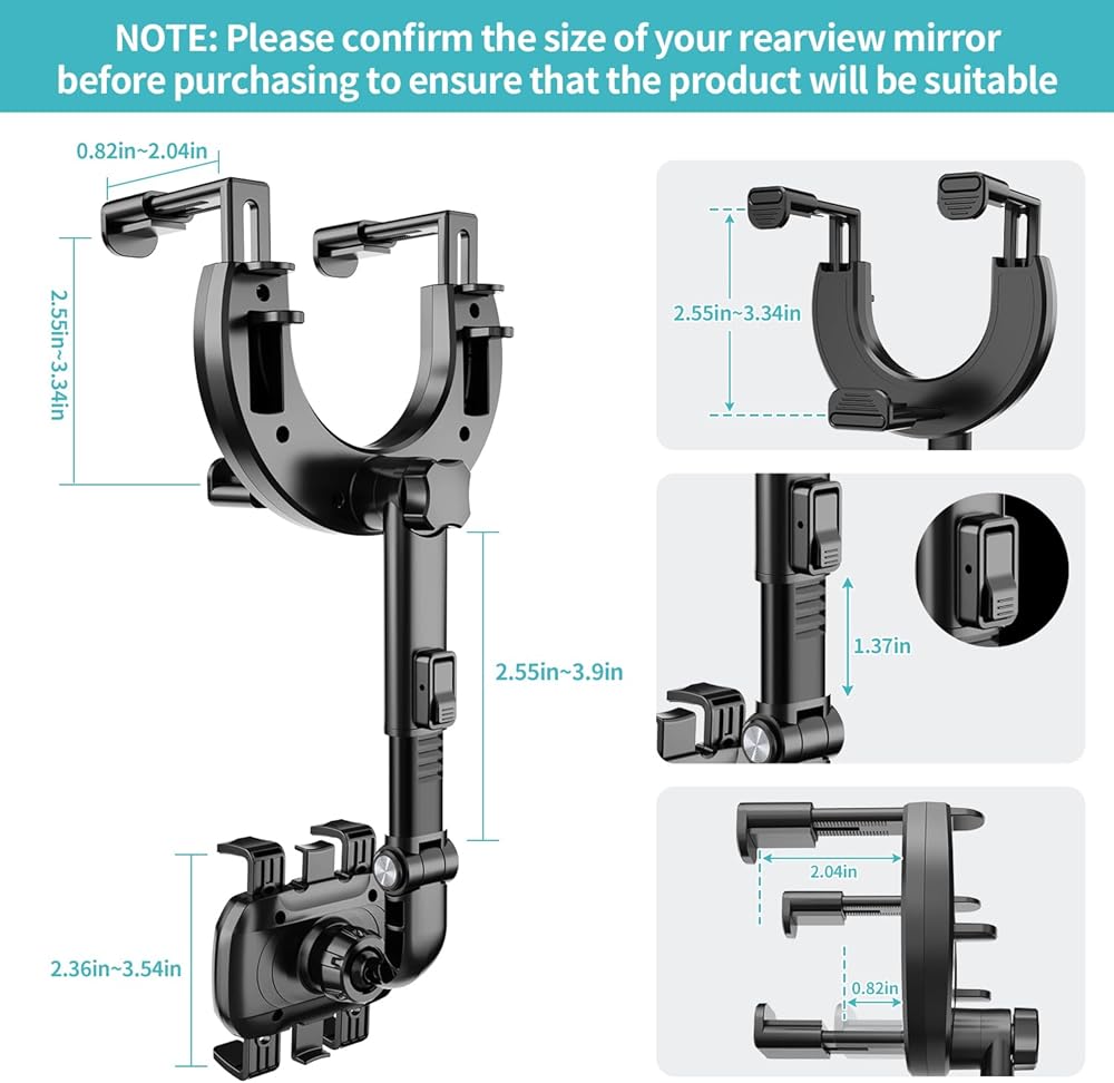 【Design for Big Rearview Mirror Phone Holder for Car】Based on the shortcomings of the old model, we upgraded the rearview mirror fixed arm to a stretchable adjustable arm(from 5.9'' to 7.7''). So this cell phone holder car fit more rearview mirrors with a width of 3.22'' - 4.52'' and a thickness of 0.94'' - 2.28''.