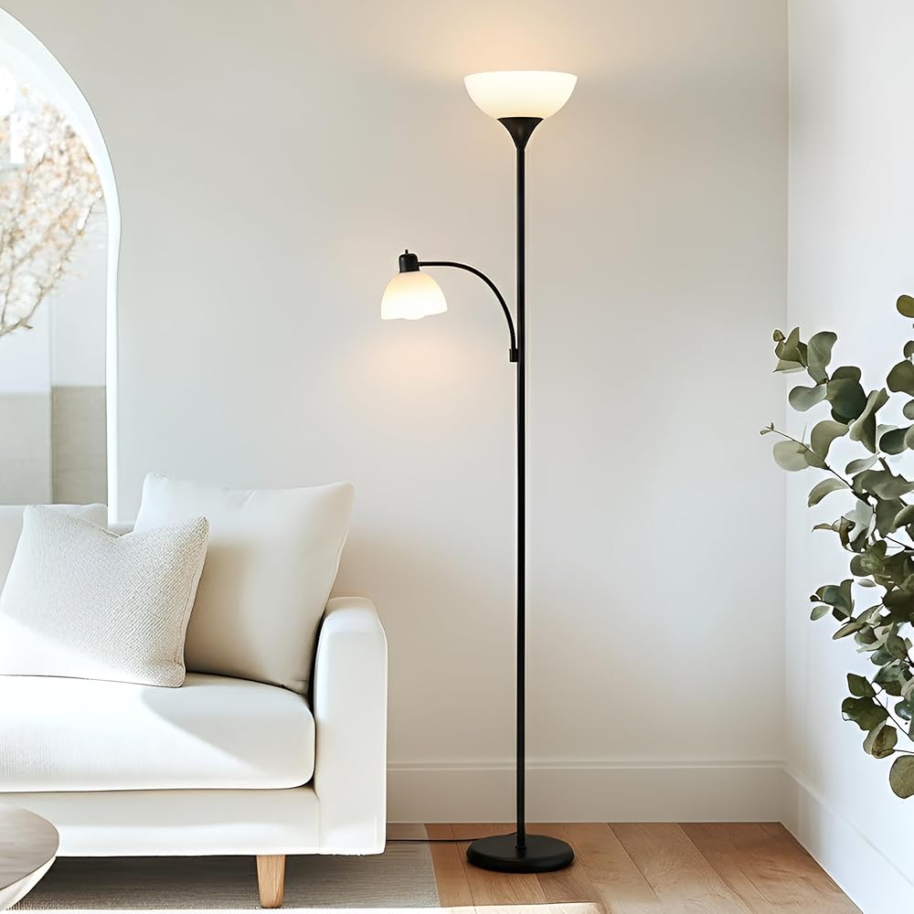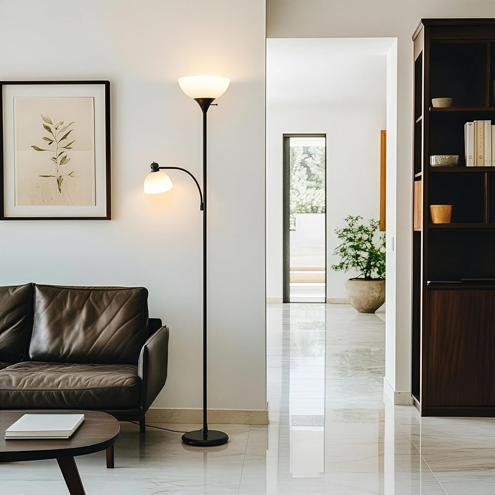3-Way Dimmer Floor Lamp: The Brightech Sky Dome Plus' design and colors fit well with mid-century modern, casual, and contemporary living room decor. This contemporary, slender tall lamp slides unobtrusively into narrow corners, and the base fits beneath your sofa. Convenient, as the mother-daughter lights on flexible arms can reach over the couch to point light at your reading or crafts.