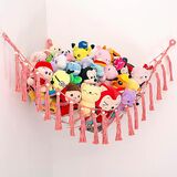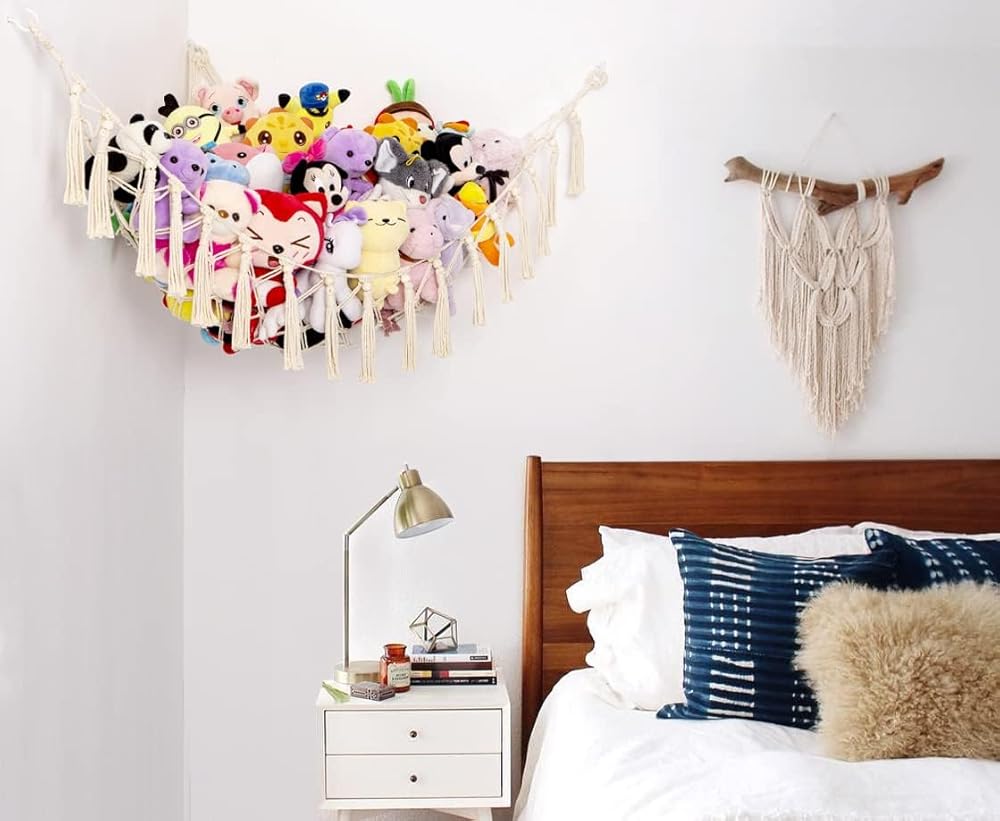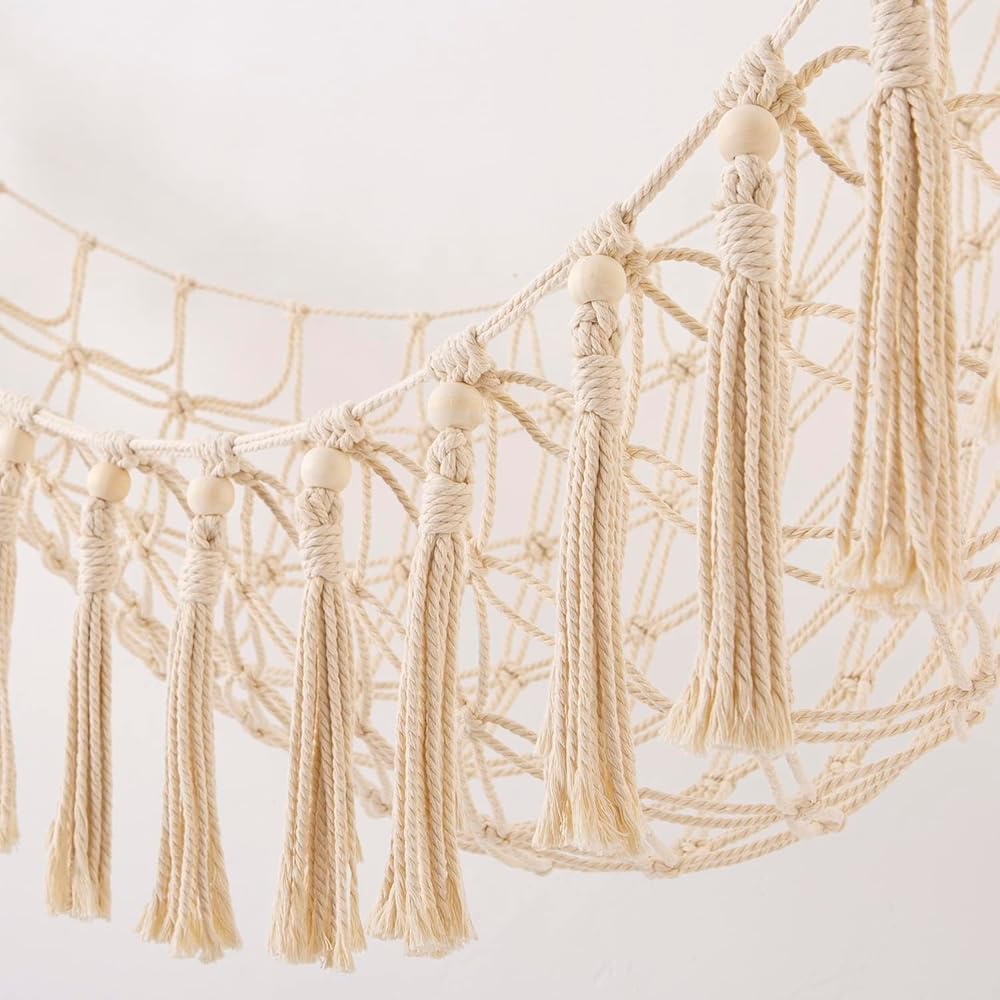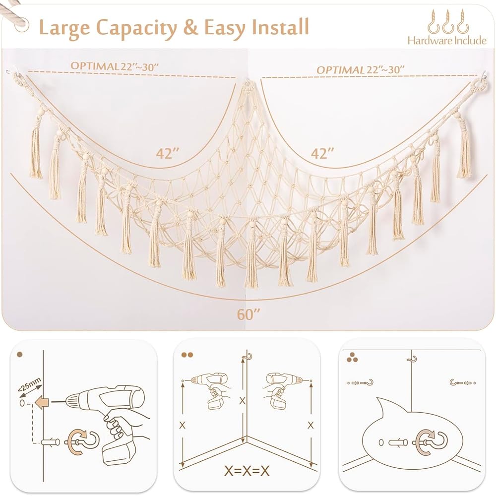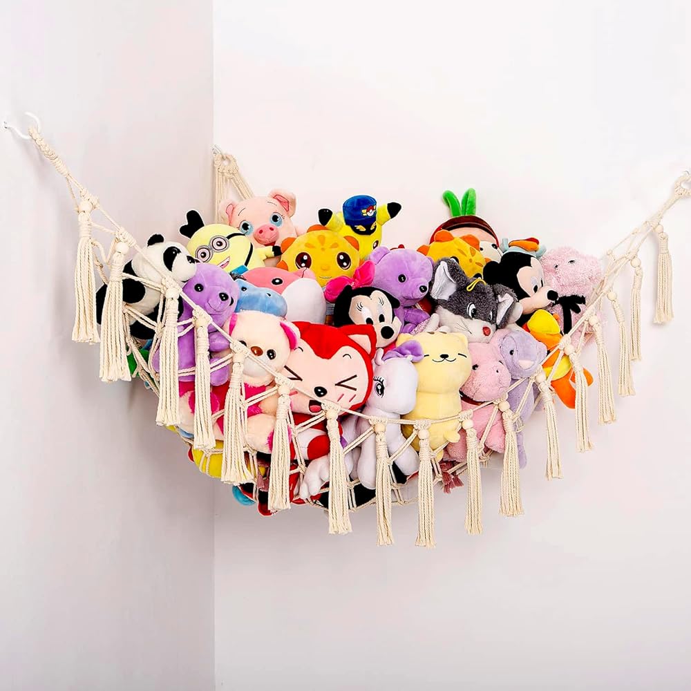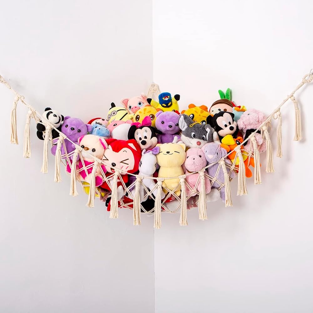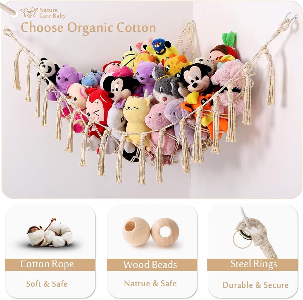 Stuffed Animals Hammock Corner Hanging Net with Wooden Beads Macrame Stuffed Animal Storage Ideas Plush Holder Toy Organizer for Boho Nursery Playroom Bedroom Kids Room Decor (cream, X-Large)