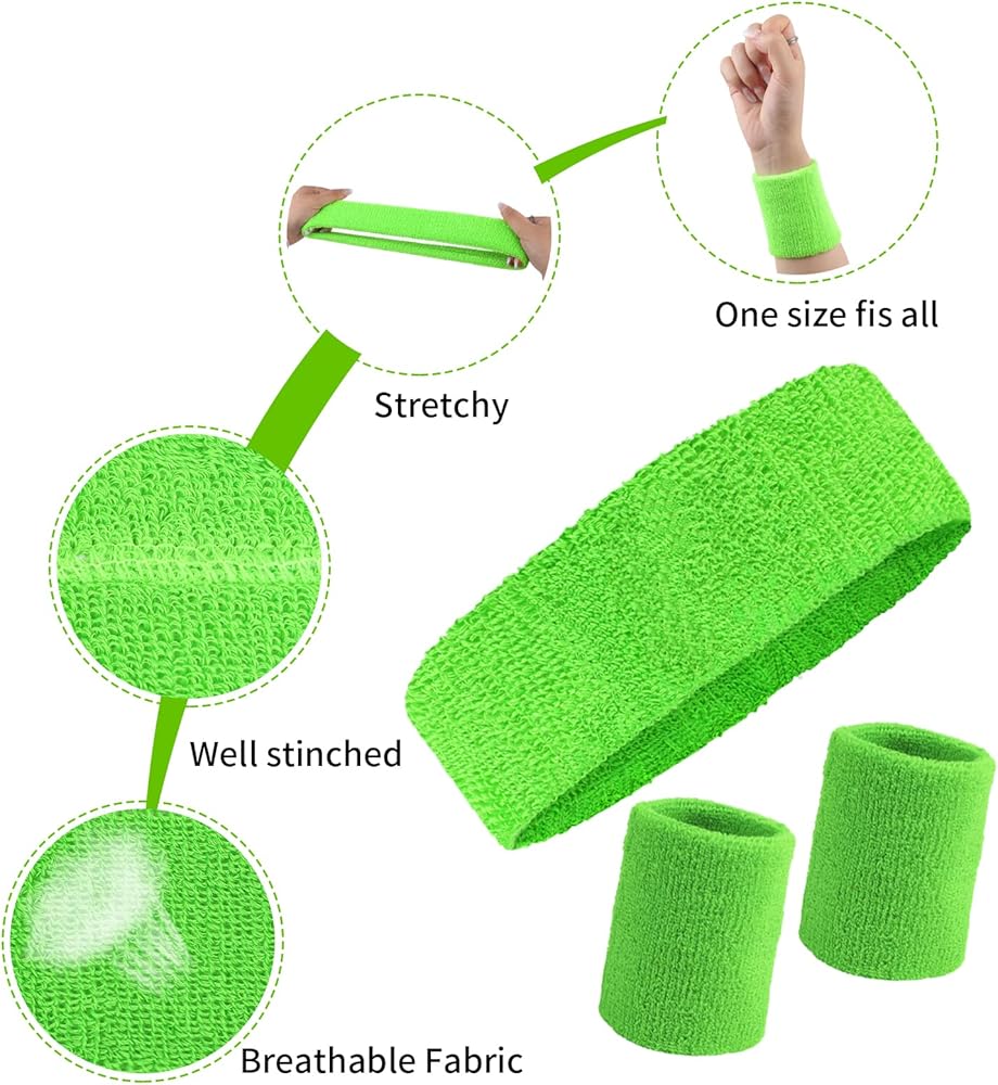 Package Includes:3pcs sweatbands and 6pcs wristbands are included in total;comes with 3 bright colors,including green,pink and yellow.