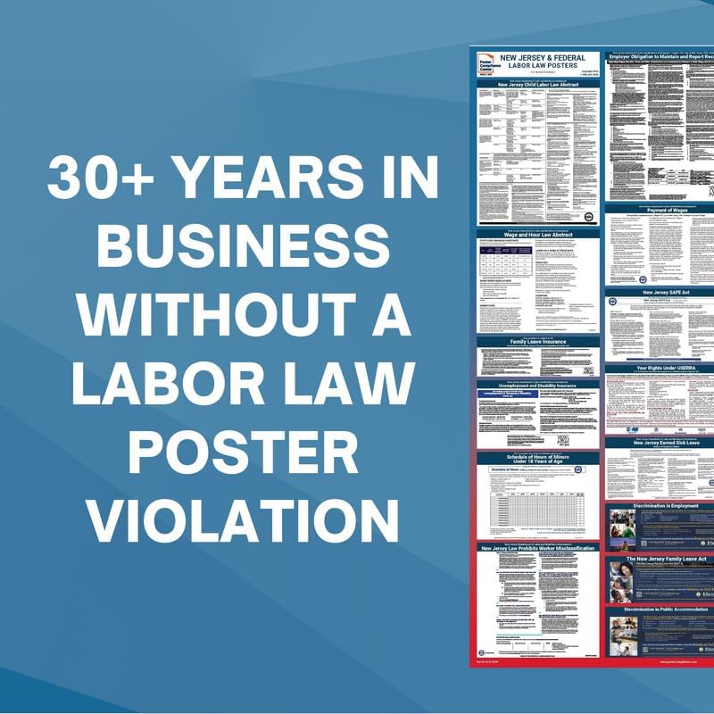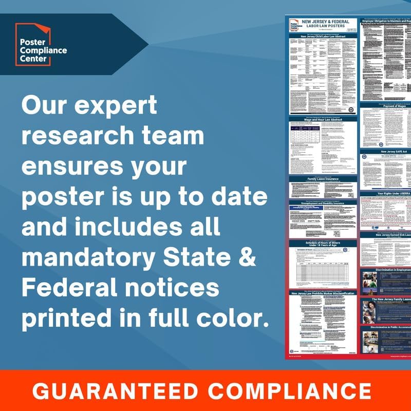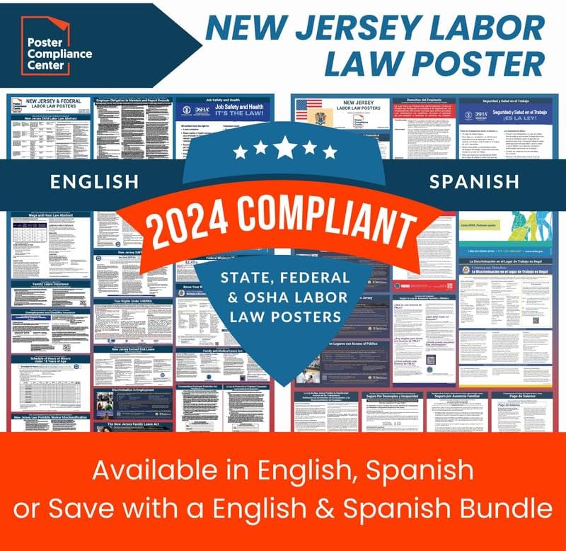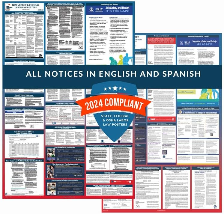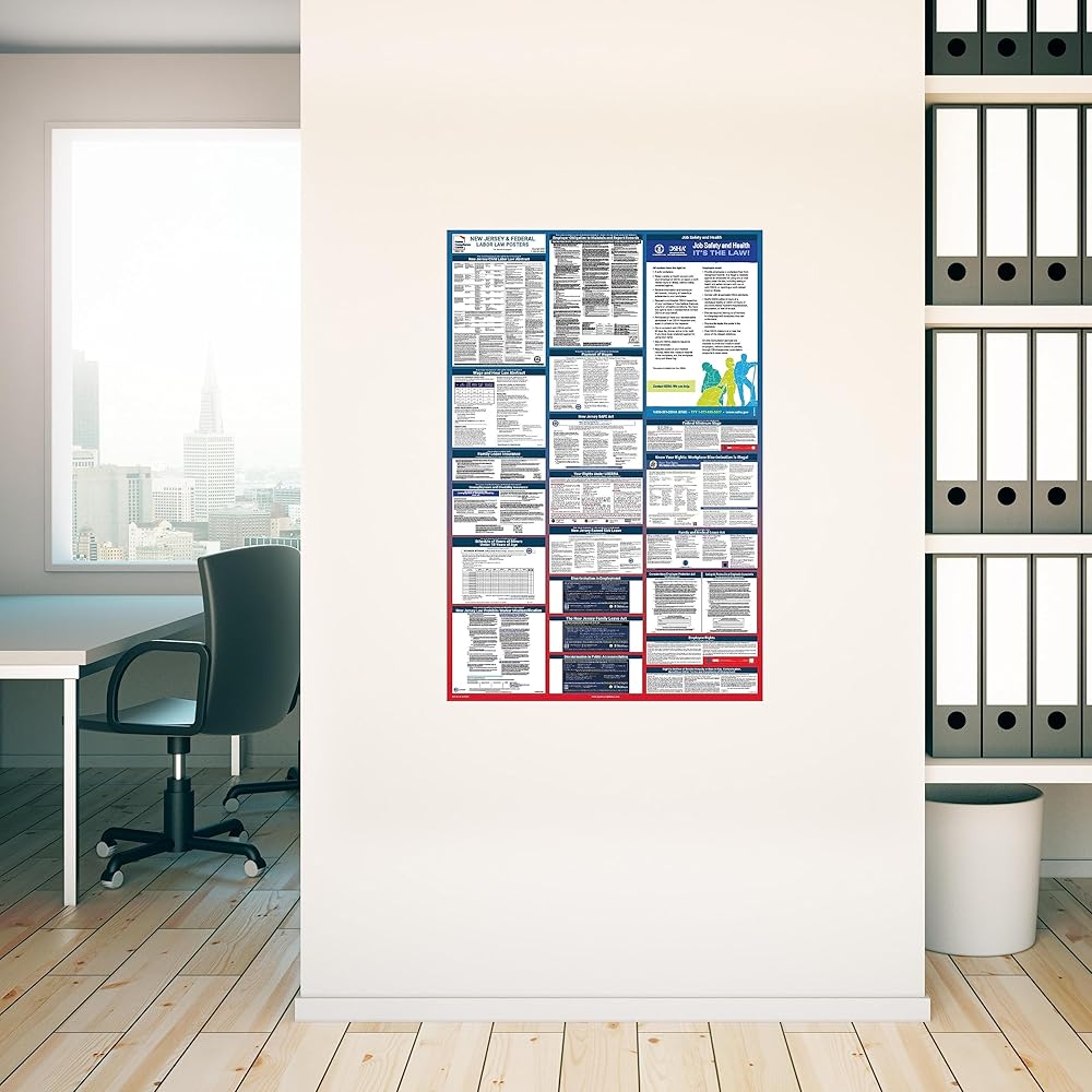 GUARANTEED COMPLIANCE & ACCURACY: Most up to date 2024 New Jersey State and Federal Labor Law Poster with all notices in one simplified design. Display notices such as minimum wage, OSHA, USERRA, Workers' Compensation, FMLA, Workplace Discrimination is Illegal, and more. Our compliance notices are regularly audited - in over 30 years of business, we have never incurred a labor law violation!