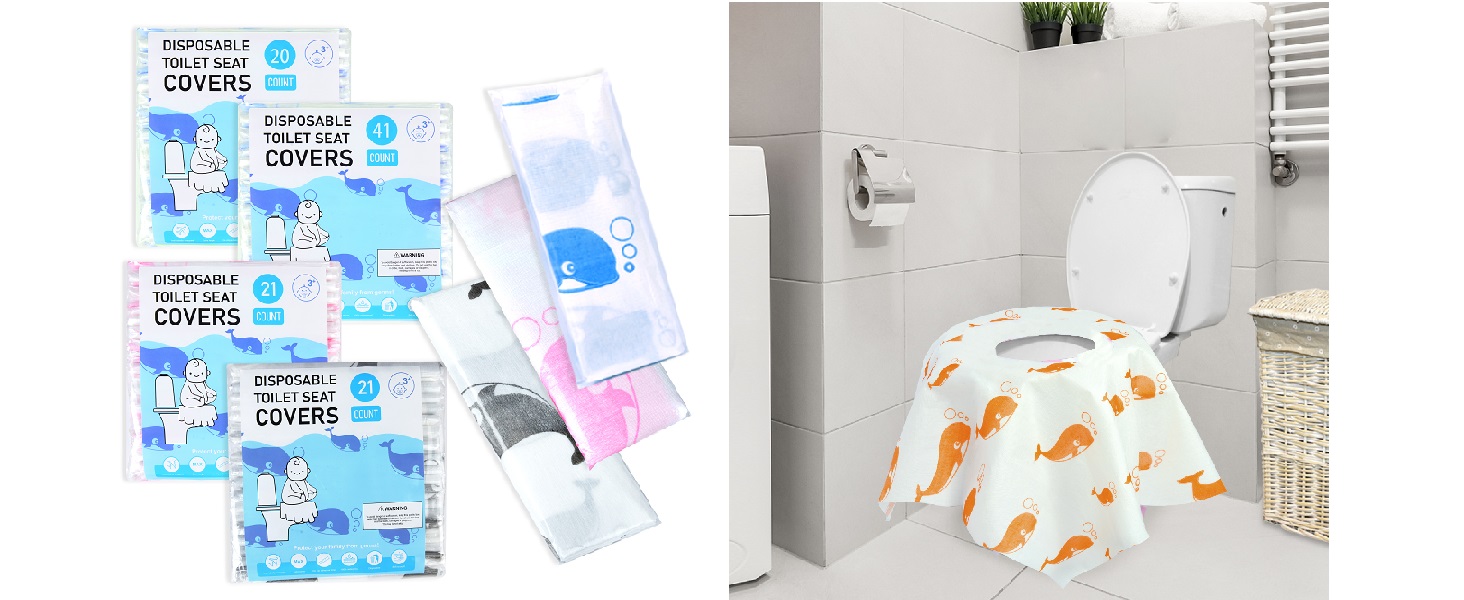 😊[Non-Slip & Anti-Stick Toilet Seat Protectors] - Two adhesive strips are designed for keeping disposable toilet seat covers in place - No more loose potty training seat covers for kids who like to move around. Our waterproof toilet seat covers won't stick to your skin when you stand up.
