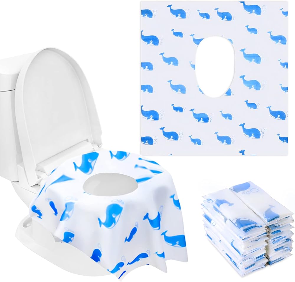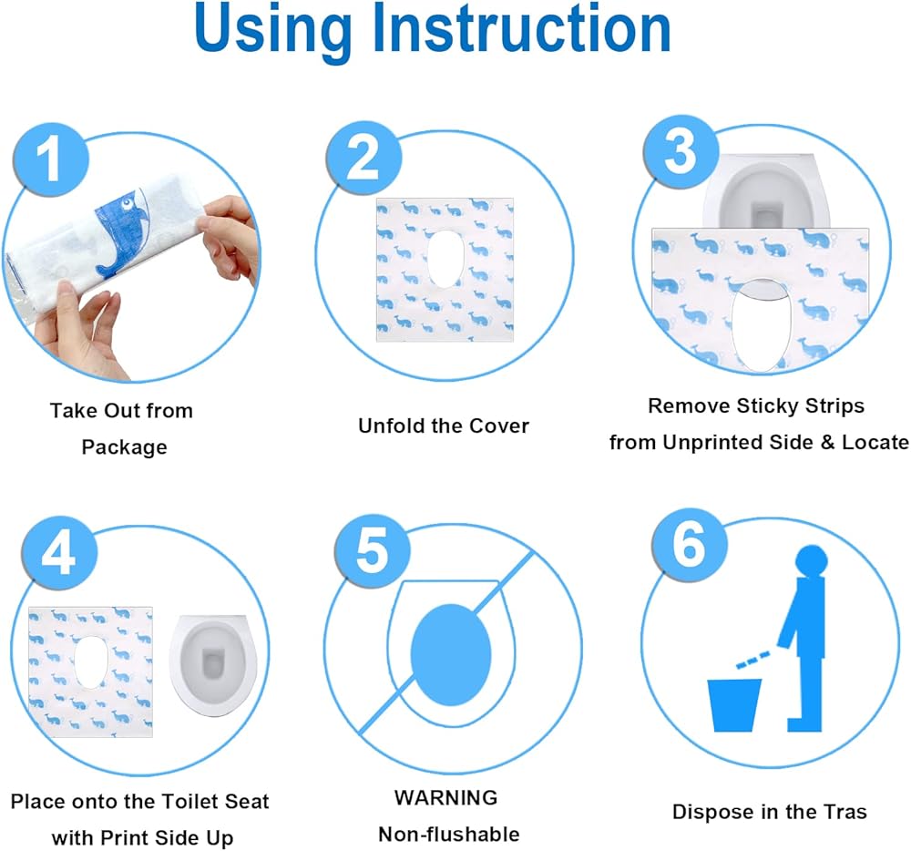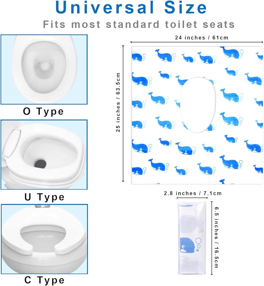 ✅[Multipurpose & Easy to Use Disposable Toilet Seat Covers] - Our toilet seat liners are essentials for potty training, traveling, public bathroom, and airplane. Pull one from the package, unfold and reveal the 2 adhesive tabs, lay on seat and ready to use. Throw to the trash can after use.