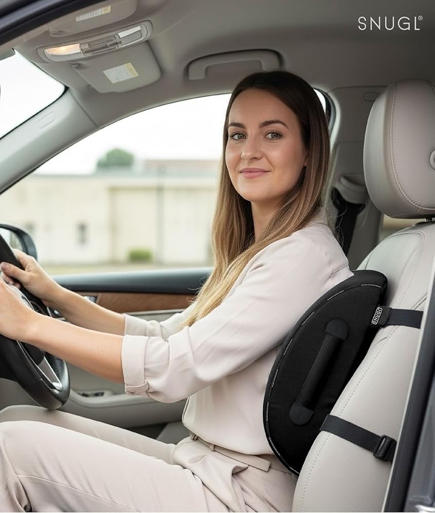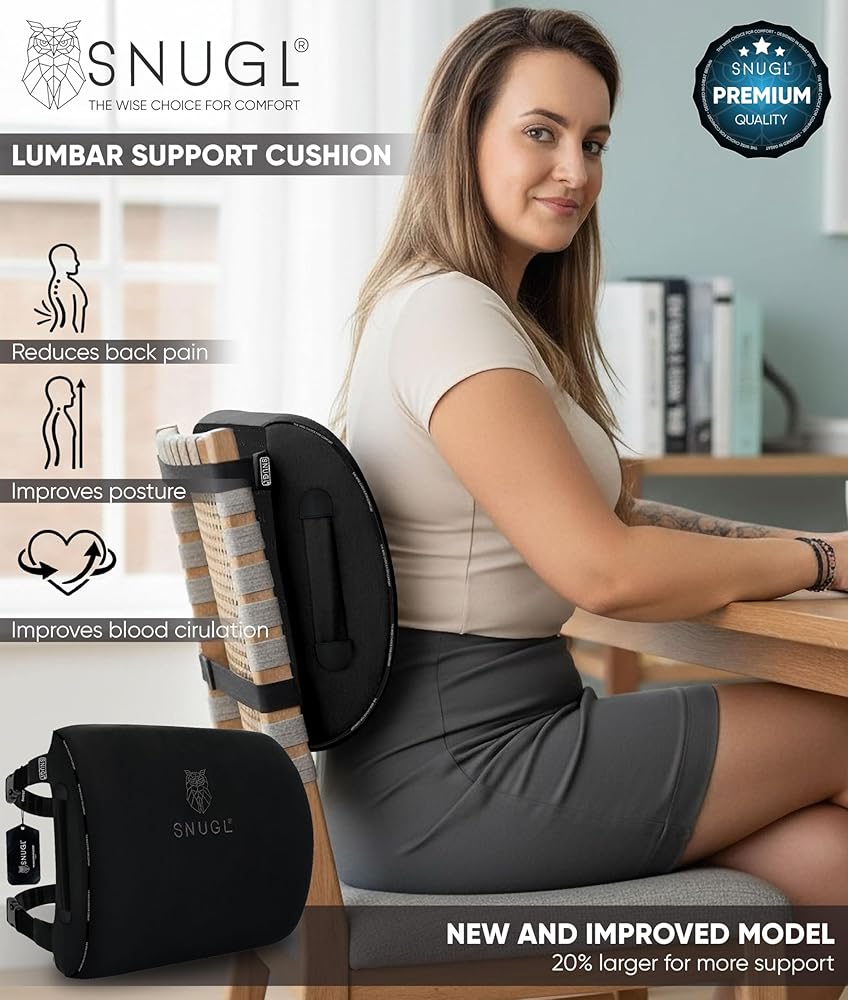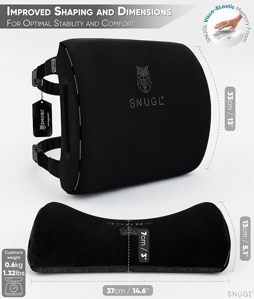 ERGONOMIC MEMORY FOAM DESIGN - Do you spend a lot of time sitting at your desk or driving? Do you need lower back support? If the answer is yes, the SNUGL lower back support cushion for office chair is a must-try. Crafted with an ergonomic shape design, our lower back support for office chair cushion is engineered to complement the natural curvature of your spine. The visco-elastic memory foam core of the desk chair pillow molds to your body, providing custom support that alleviates discomfort.