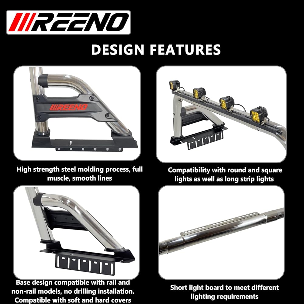 【COMPATIBILITY DESIGN 】Designed to be compatible and not obstruct factory 3rd brake lights. Light mount brackets for aftermarket LED light bars are included. (Lights NOT included),Compatible with tonneau covers and most tri-fold covers mounted on top of the truck bed rails; sport bar may limit the opening of the covers. Its functional design prevents cargo dumping while safeguarding your rear window from potential harm – all while adding a touch of sophistication to your vehicle's exterior aesthetics.