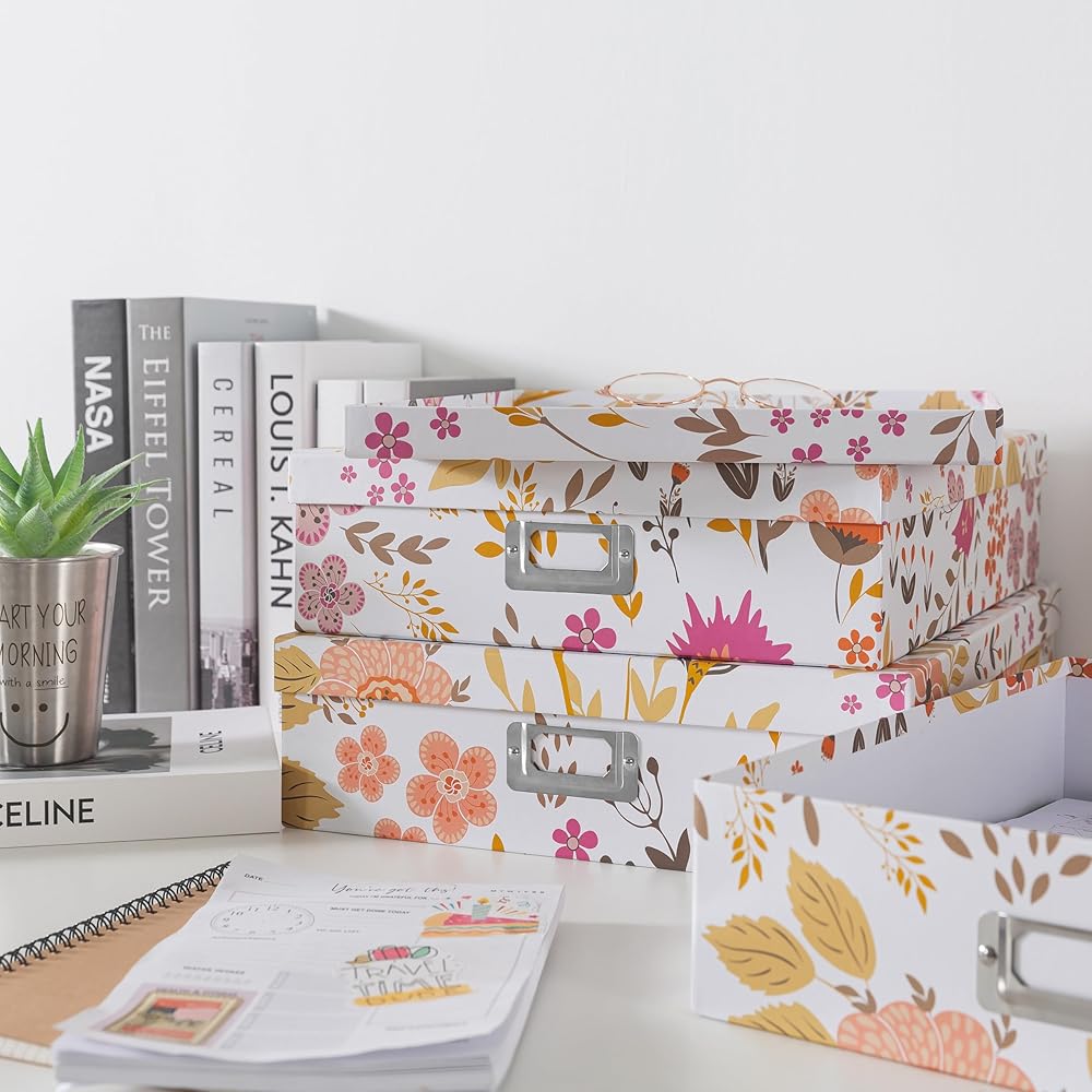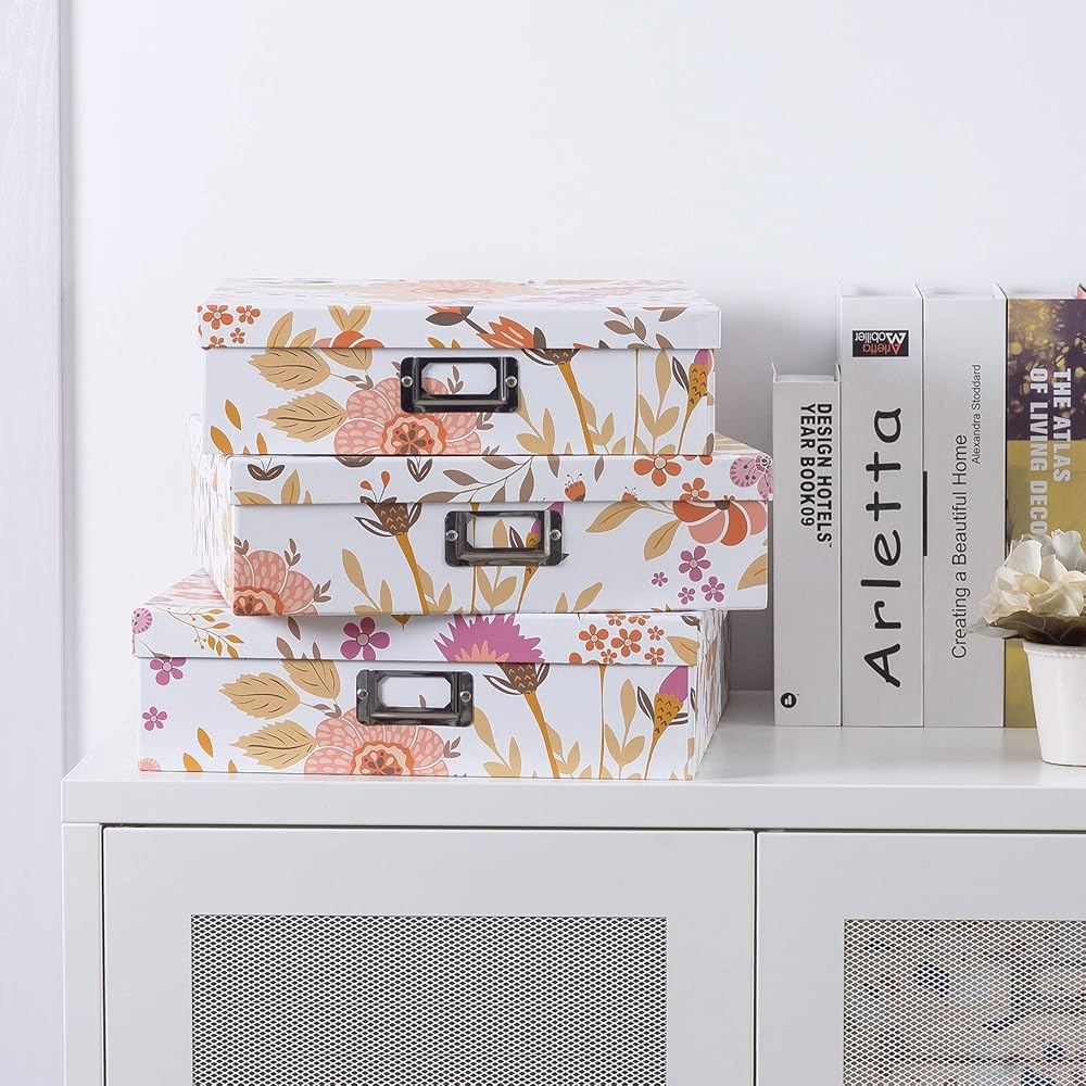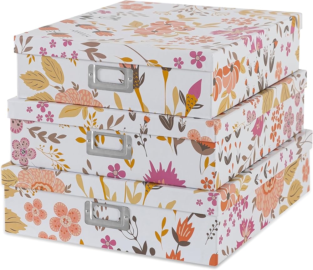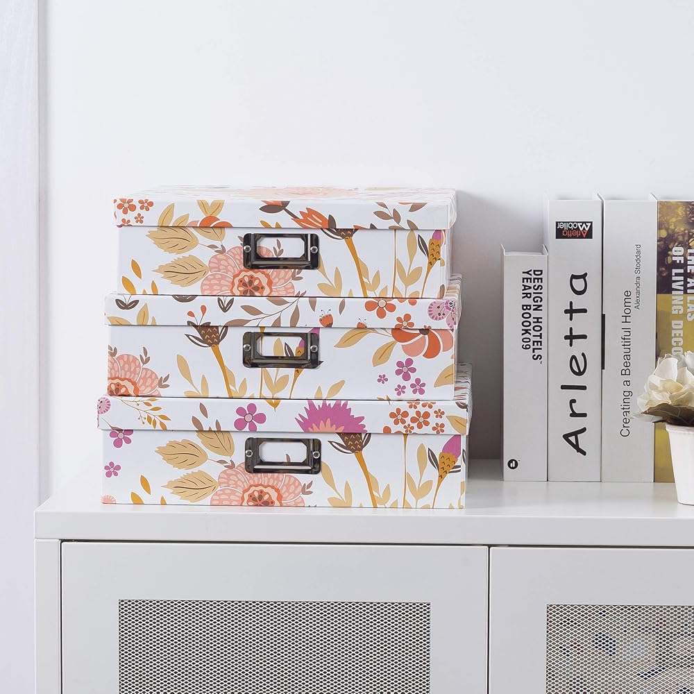 DURABLE CONSTRUCTION: Made from sturdy paperboard, these decorative photo storage boxes withstand regular use. With strong lids and the ability to stack, these large decorative storage boxes with lids provide an efficient storage solution. The included metal nameplates offer an easy labeling option.